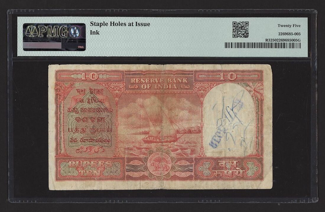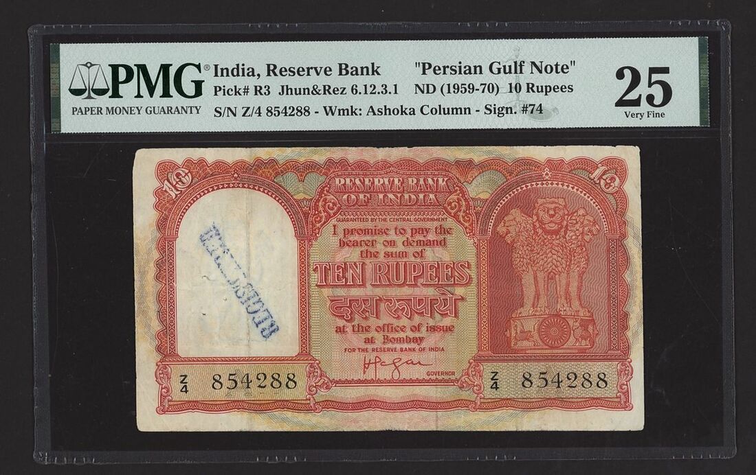 (x) Reserve Bank of India (Persian Gulf Note), 10 Rupees, ND (1959-70), serial number Z/4 854288, (Pick R3, BNB R202a, Jhun&Rez 6.12.3.1), in PMG holder 25 Very Fine, staple holes at issue, ink stamp