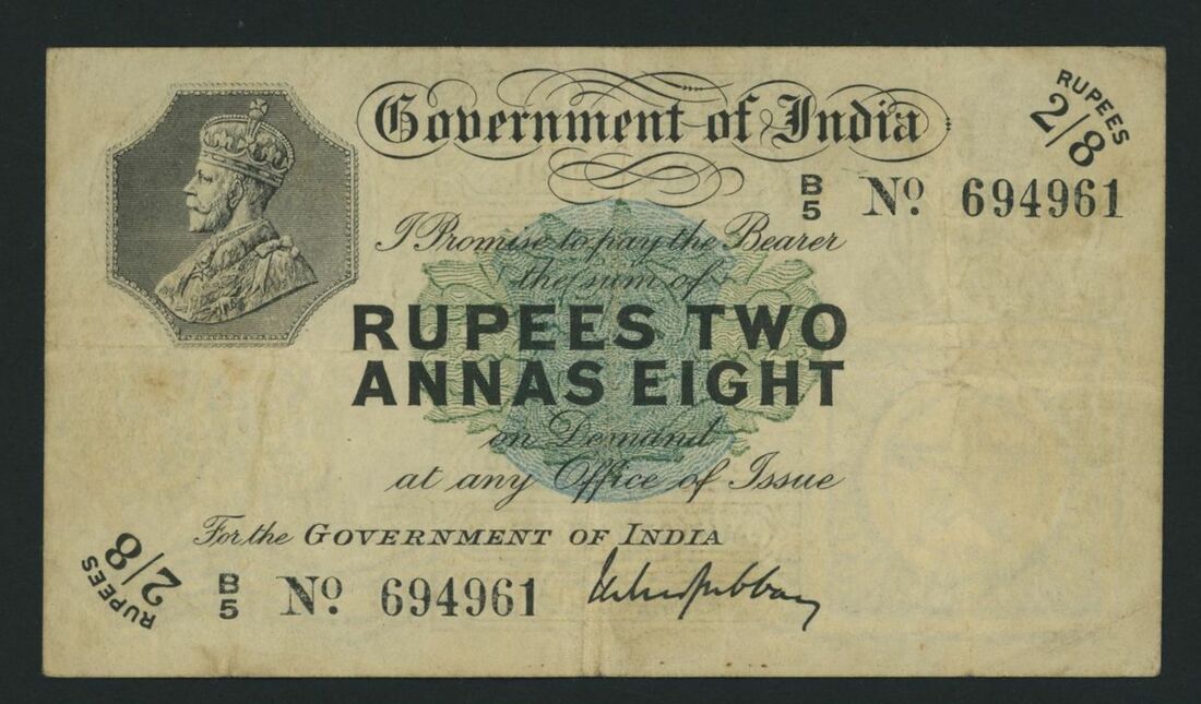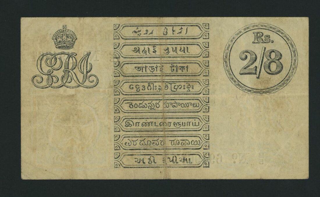 Government of India, 2/8 Rupees, ND (1917-8), serial number B5 694961, (Pick 2, BNB 136a2), extremely fine, some discolouration