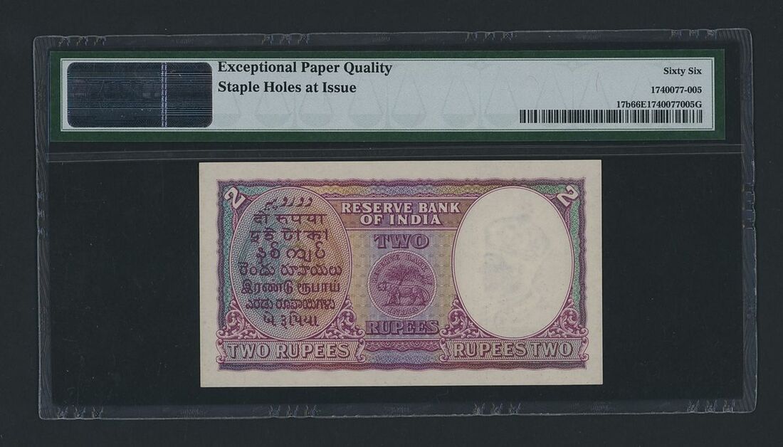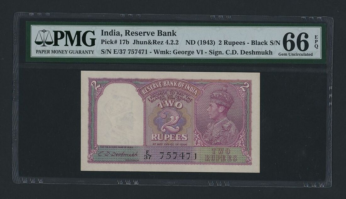 (x) Reserve Bank of India, 2 Rupees, ND (1943), black serial number E/37 757471, (Pick 17b, Jhun&Rez 4.2.2, BNB 201), in PMG holder 66 EPQ Gem Uncirculated, staple holes at issue