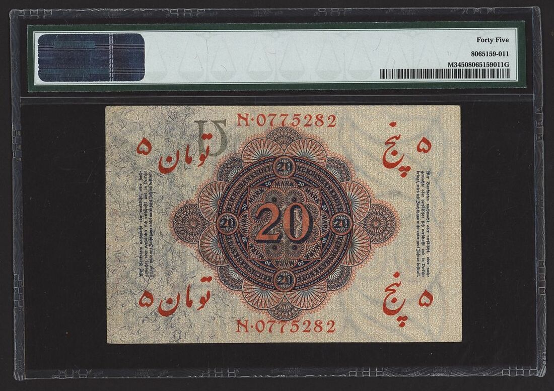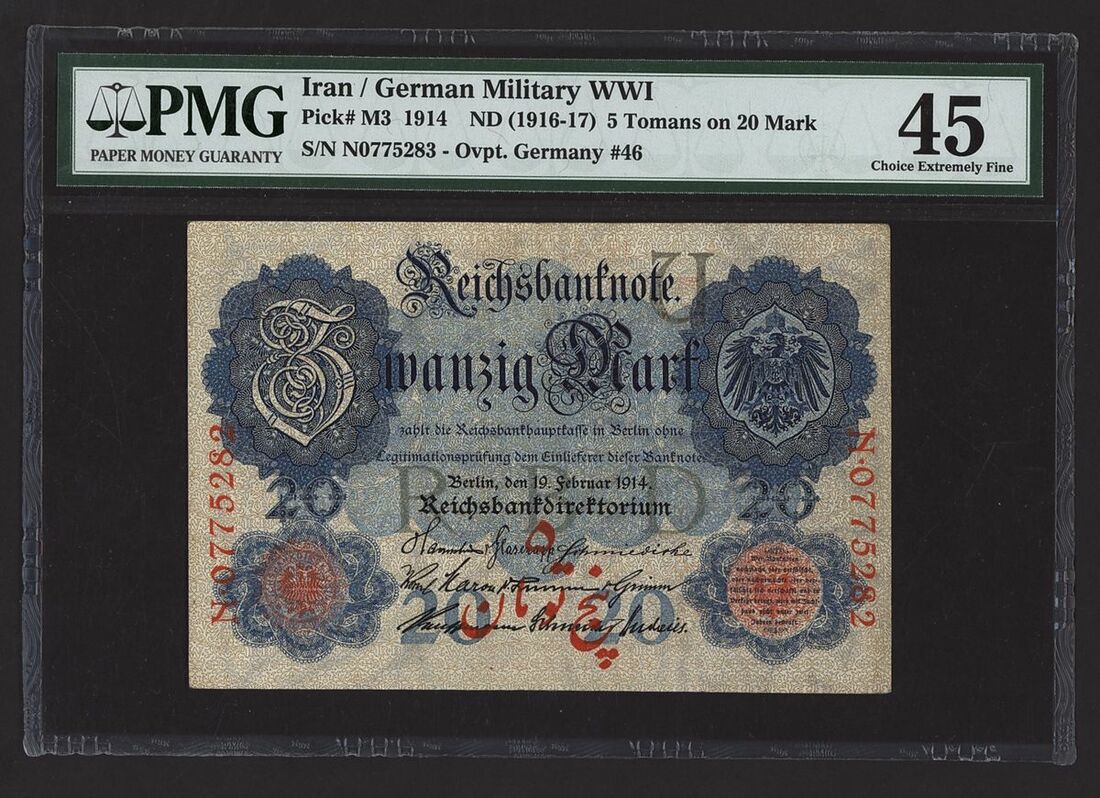 (x) German Military WWII, Iran 5 Tomans on 20 Mark, ND (1916/17), serial number N0775283, this remarkable banknote serves as a remnant from a significant period of modern history. Iran's strategic location made it of great importance to both the Allied and Central Powers during the war. However, it was Germany that established a diplomatic and military mission within Iran. Despite Iran's declaration of neutrality at the outset of war in 1914, Germany utilised its mission in Iran for subversive operations and the collection of intelligence aimed at undermining British and Russian influence in the region. Germany aimed to solidify its economic power and access to resources through the circulation of banknotes within Iran, with Iranian oil reserves being essential for Germany's military and industrial needs. Originally a 20 Mark note with a red 5 Toman overprint, the intricate design and vibrant colours on this banknote are captivating. While visually striking, this evocative banknote also represents a poignant chapter in global history