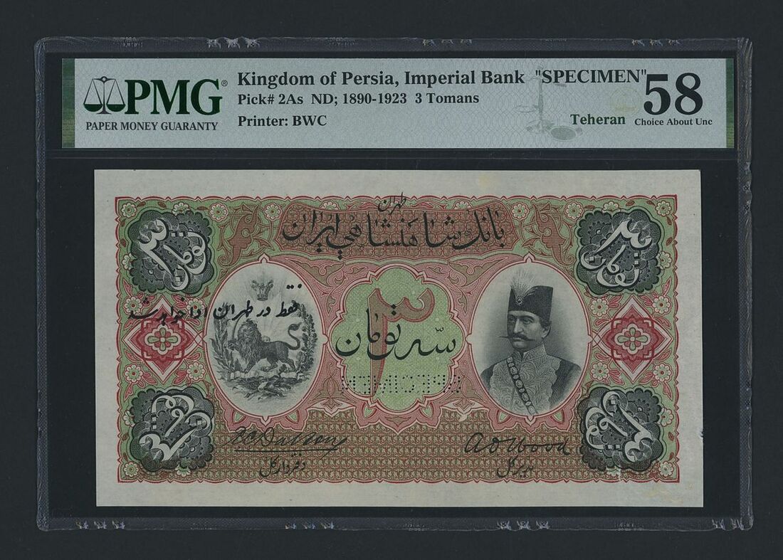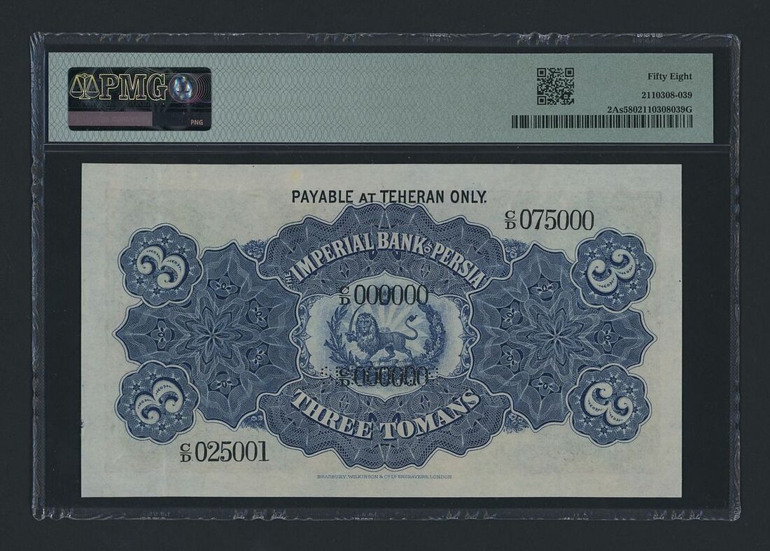 (x) Imperial Bank of Persia, specimen 3 Tomans, Teheran, ND (1910-1918), serial number range C/D 025001-C/D075000, combination of Dalton/Wood signatures date this specimen (1910-1918)