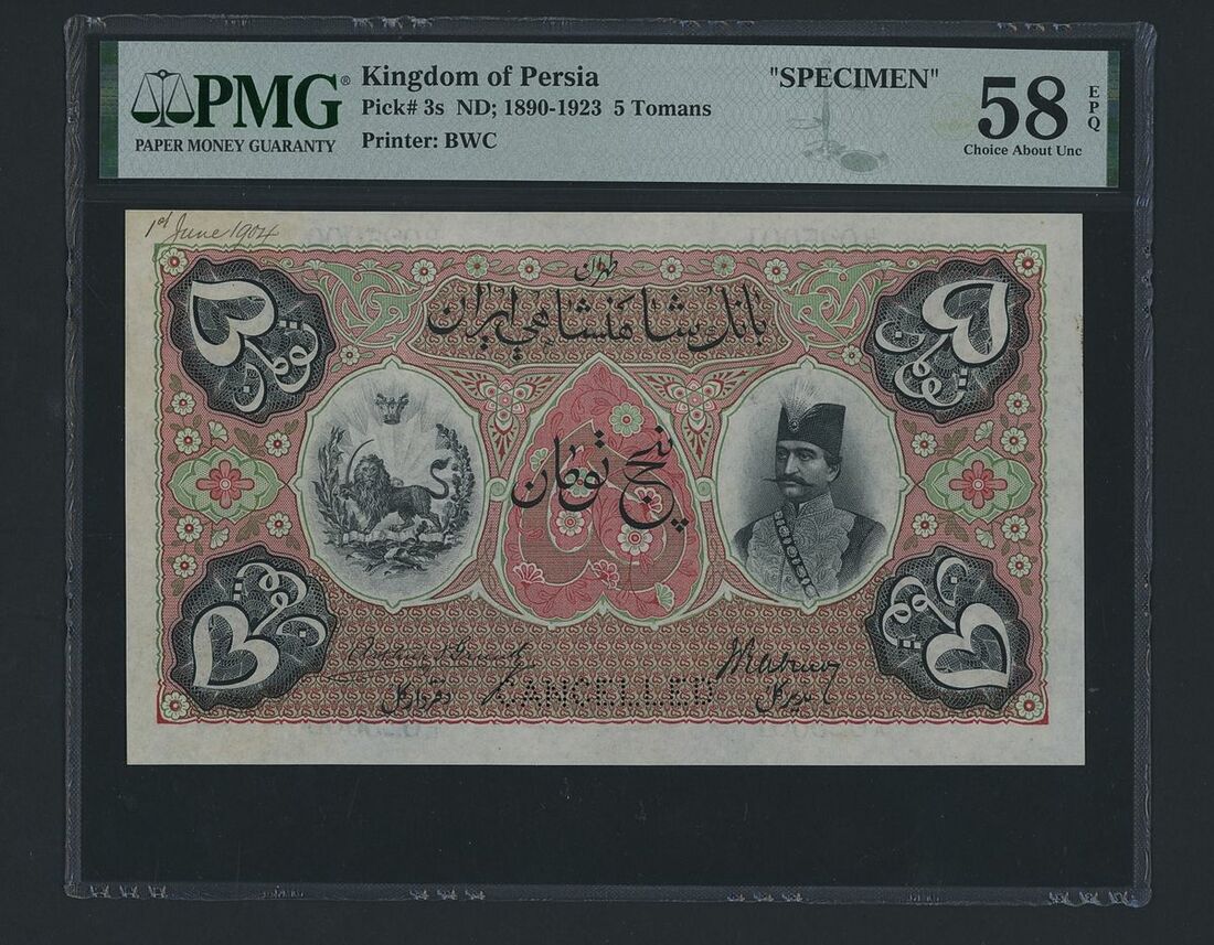(x) Imperial Bank of Persia, specimen 5 Tomans, ND (1890-1908), serial number range D/A 025001 - D/B 025000, combination of Arthur F. Grundy/Joseph Rabino signatures, pencil annotation date this specimen 1st June 1904