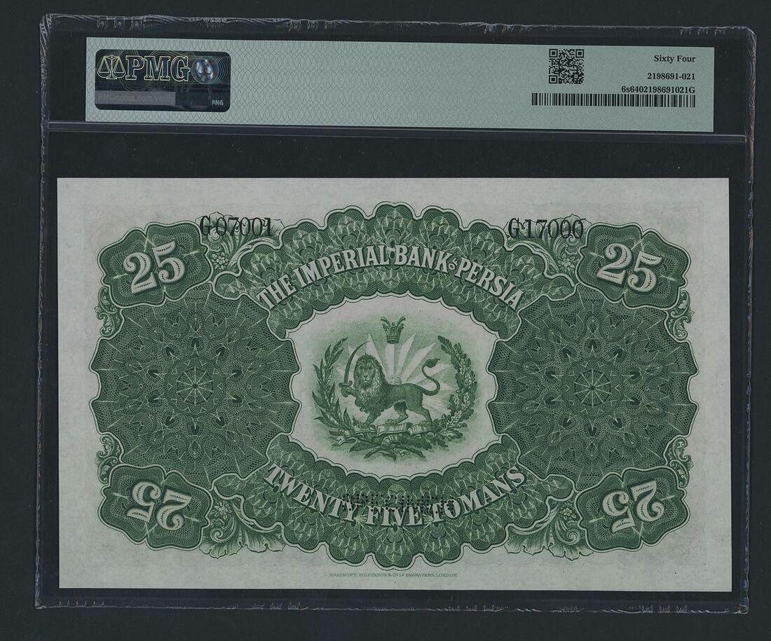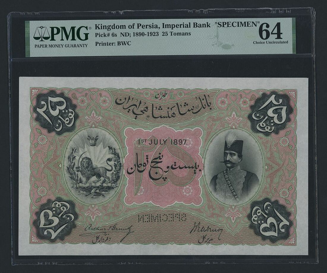 (x) Imperial Bank of Persia, specimen 25 Tomans, 1st July 1897, serial number range G 07001 - G 17000, (Pick 6s, BNB 108), in PMG holder 64 Choice Uncirculated, only 1 note in higher grade at PMG