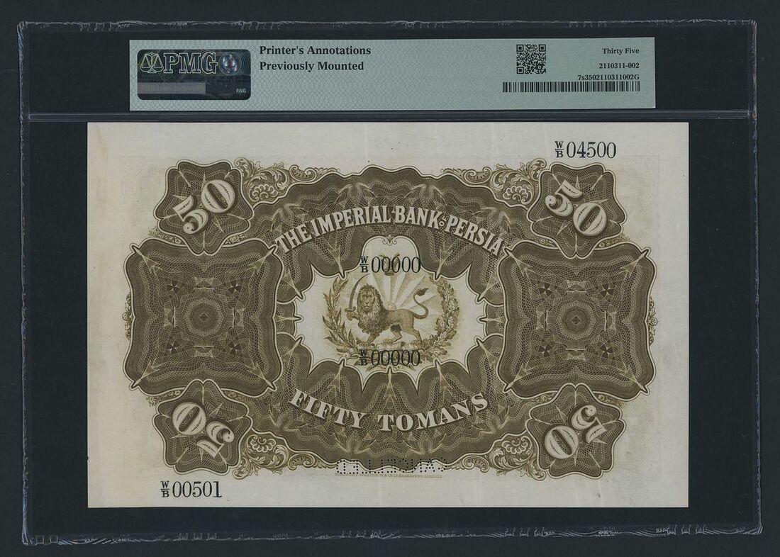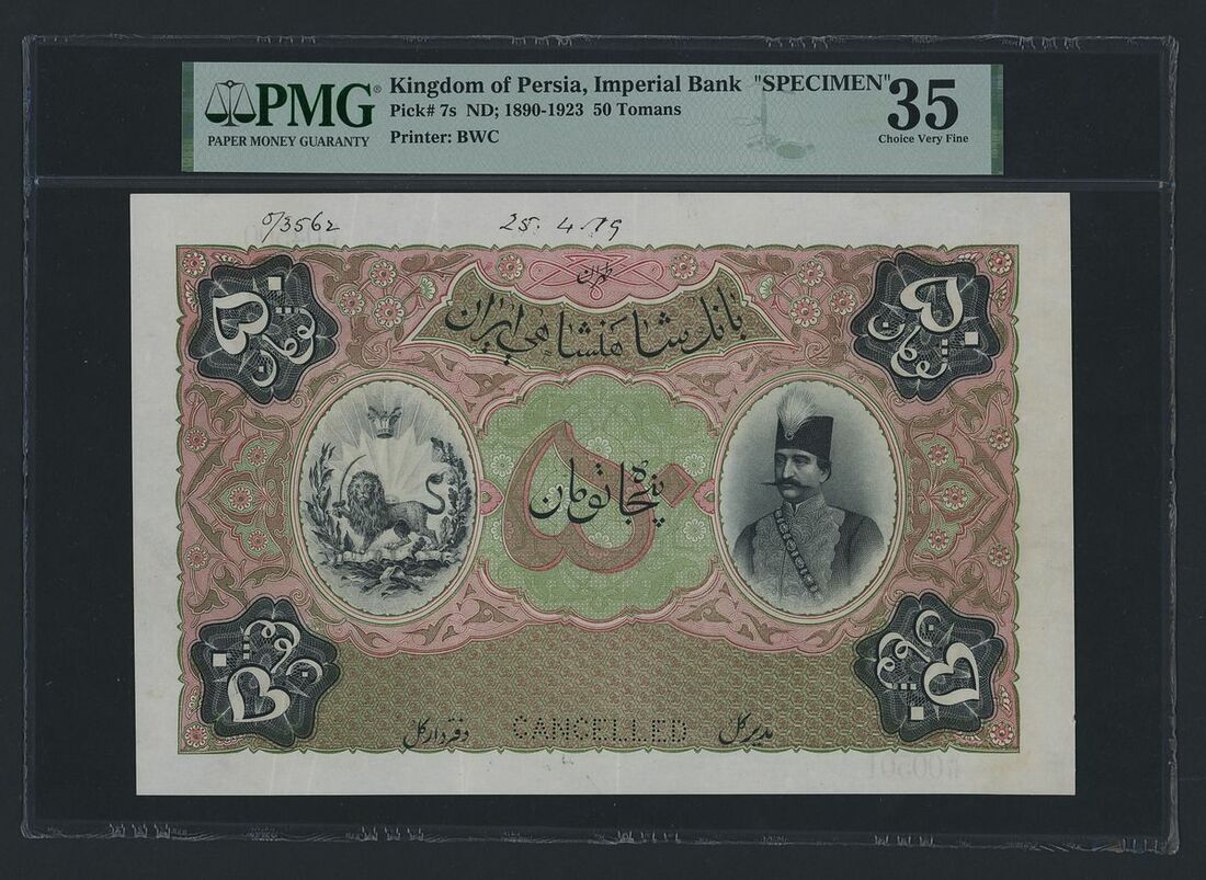 (x) Imperial Bank of Persia, specimen 50 Tomans, 1890-1923, serial number range W/B 00501 - W/B 04500, pencil annotation on the obverse top margin dates this specimen 25th April 1919