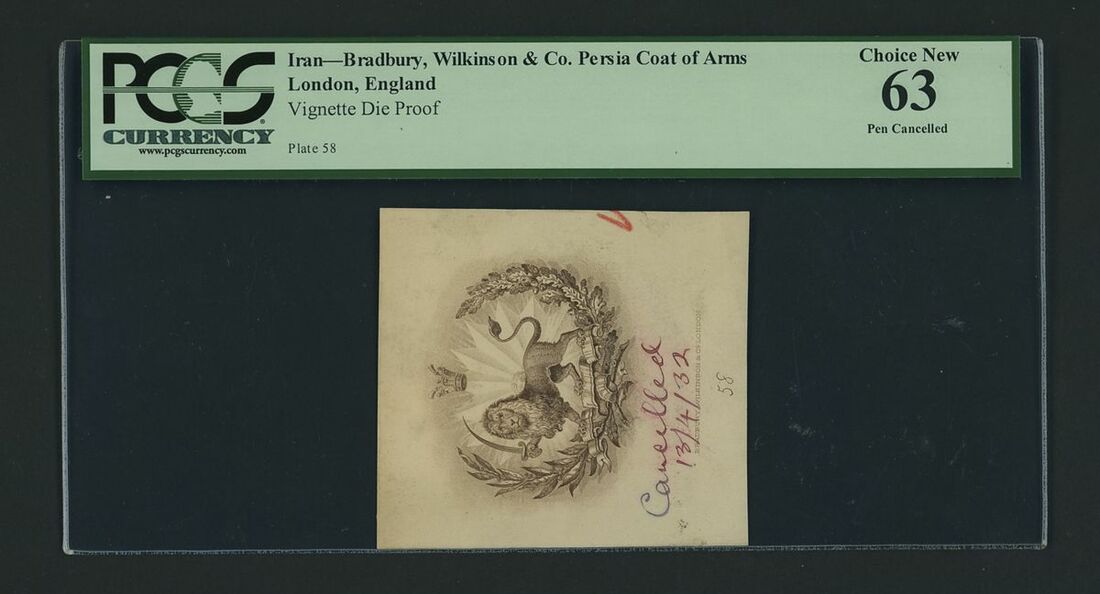 (x) Iran, Vignette die Proof for Persia Coat of Arms, plate 58, pen cancelled dated 13/4/32 in red between the Lion and Sun motif (Persia Coat of Arms) and the printing company, Bradbury Wilkinson & Co., London,