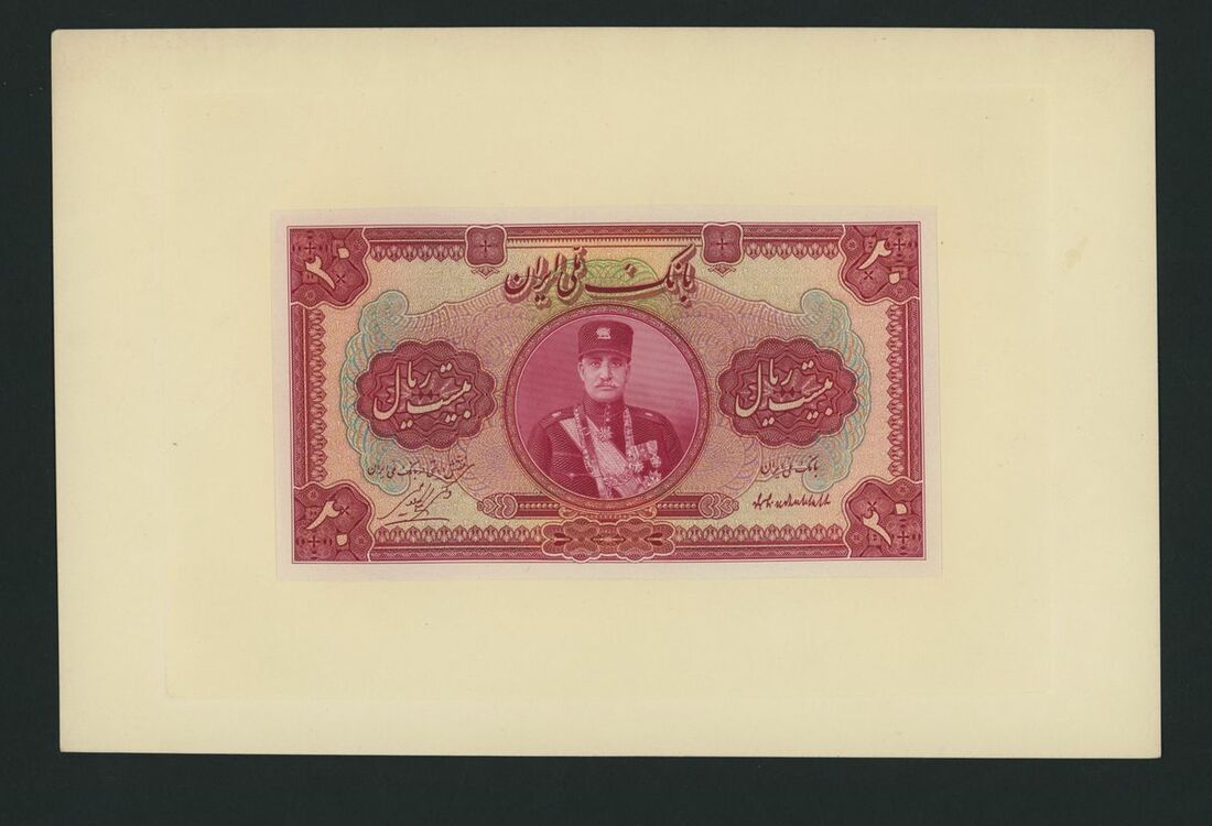 (x) Bank Melli, Iran, obverse and reverse proofs for 20 Rials, 1932 issues, (Pick 20, BNB 103), stuck on card, as made, rare