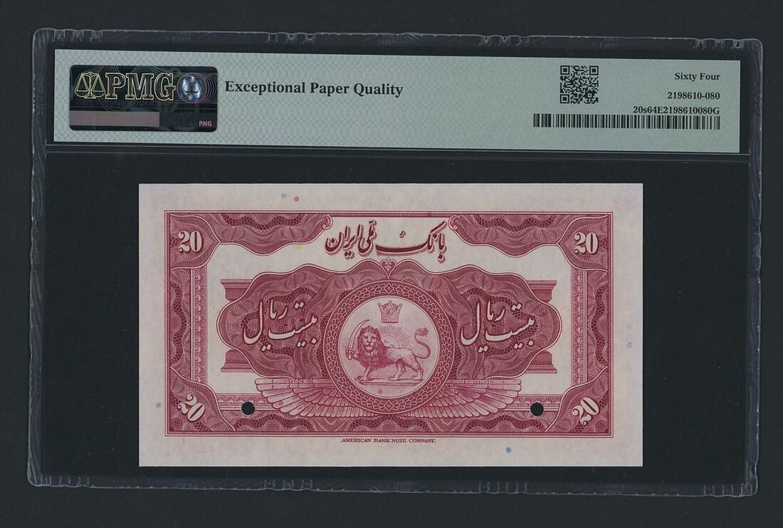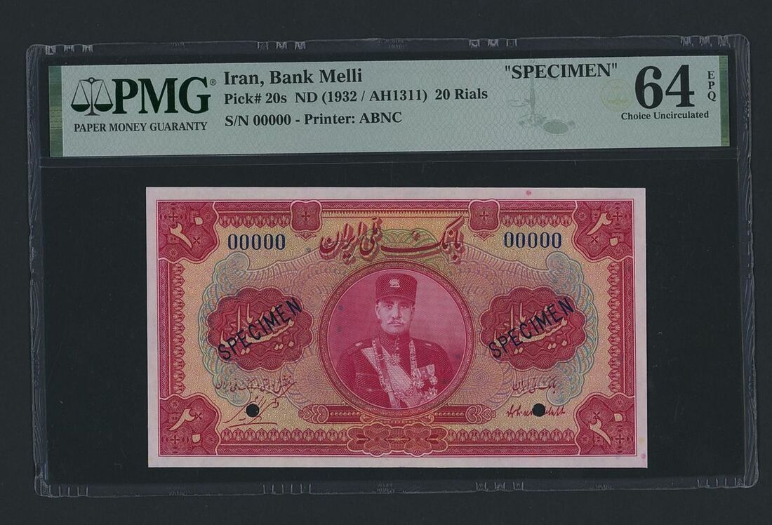 (x) Bank Melli, Iran, specimen 20 Rials, ND (1932), serial number 00000, (Pick 20s, BNB 103), in PMG holder 64 EPQ Choice Uncirculated