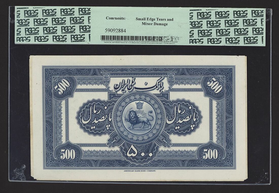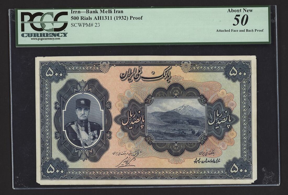 (x) Bank Melli, Iran, attached obverse and reverse Proofs 500 Rials, AH1311 (1932), (Pick 23p, BNB 106ap), in PCGS holder 50 About New, small edge tears and minor damage