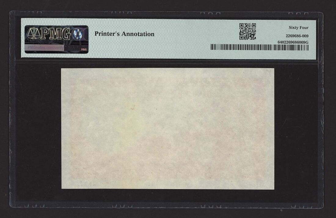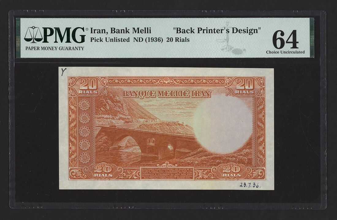 (x) Bank Melli, Iran, unissued reverse printer´s design 20 Rials, ND (1936), (Pick unlisted), in PMG holder 64 Choice Uncirculated, printer´s annotations, rare
