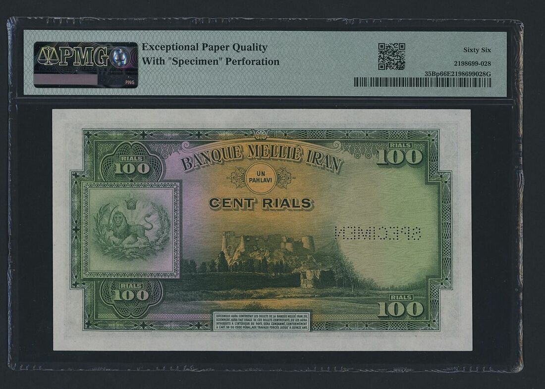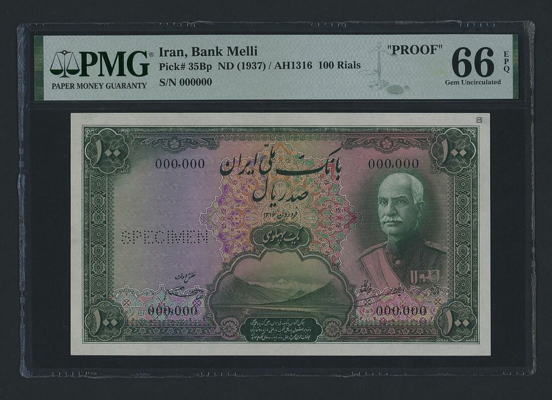 (x) Bank Melli, Iran, [Top Pop] Proof 100 Rials, ND (1937), serial number 000000, in 1920s Iran, where political landscapes were in flux, Bank Melli Iran emerged as a pivotal player. It coincided with the transformative period marked by the ascension of Reza Shah Pahlavi to power in 1925. This era, characterized by sweeping economic policies and a fervent push for modernisation, witnessed the rapid establishment of Bank Melli as a cornerstone in Iran's evolving financial realm. Amidst the political upheaval of the time, Reza Shah Pahlavi seized control through a military coup, embarking on a visionary quest to propel Iran towards modernity. His reign extended from 1925 to 1941 and unfolded against a backdrop of ambitious reforms encompassing secularization, education, and infrastructure development.