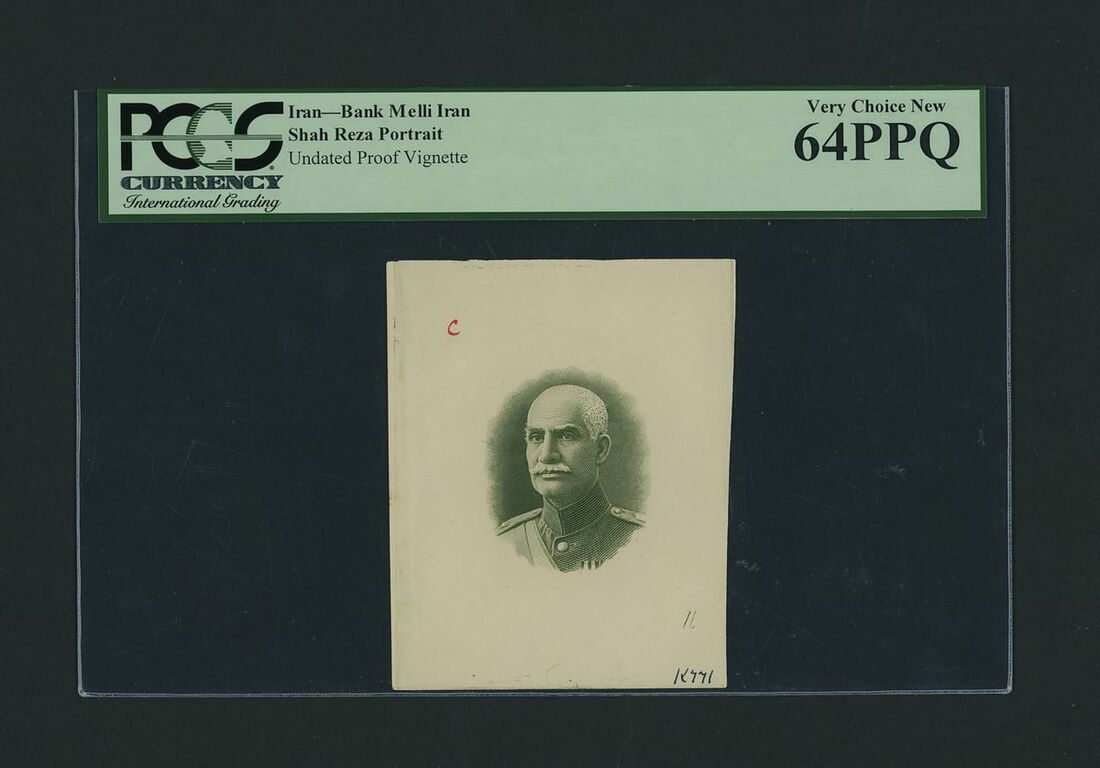 (x) Bank Melli, Iran, Proof Vignette with Shah Reza Portrait, undated, grey on tan paper with handwritten annotations on top left and bottom right