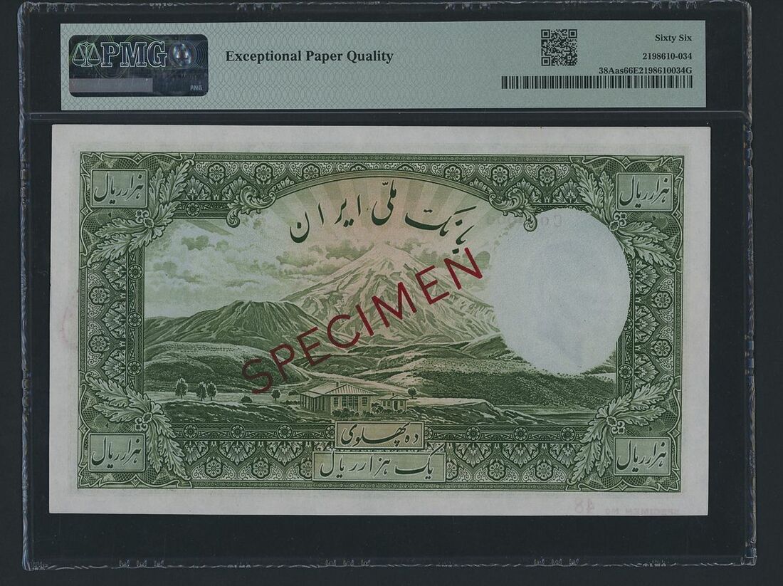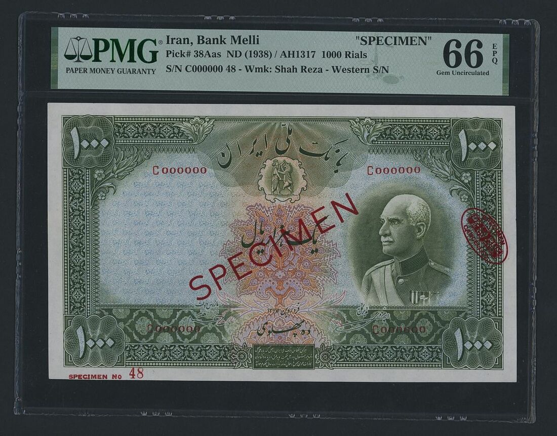 (x) Bank Melli, Iran, [Top Pop] specimen 1000 Rials, ND (1938), serial number C000000 48, (Pick 38Aas, BNB 132), in PMG holder 66 EPQ Gem Uncirculated
