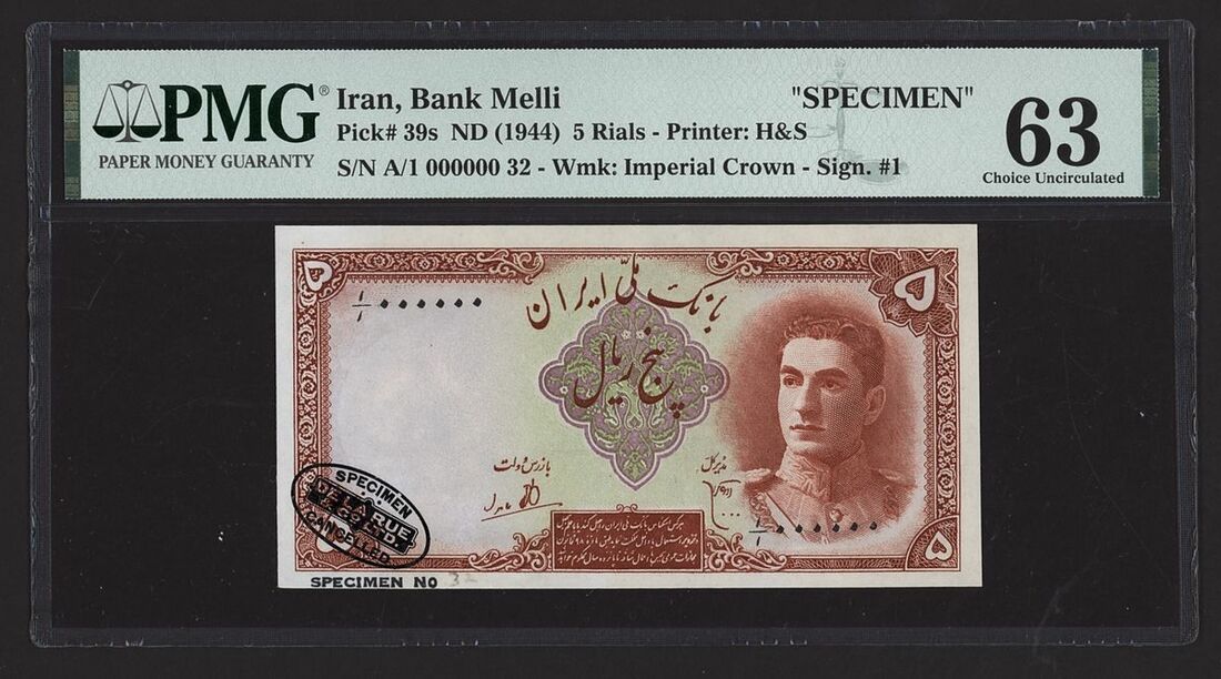 (x) Bank Melli, Iran, specimen 5 Rials, ND (1944), serial number A/1 000000 32, (Pick 39s, BNB 134), in PMG holder 63 Choice Uncirculated, previously mounted, only 1 note in higher grade at PMG, rare