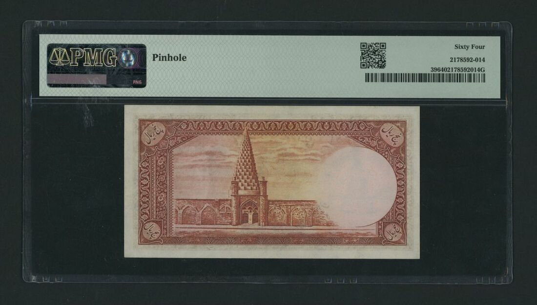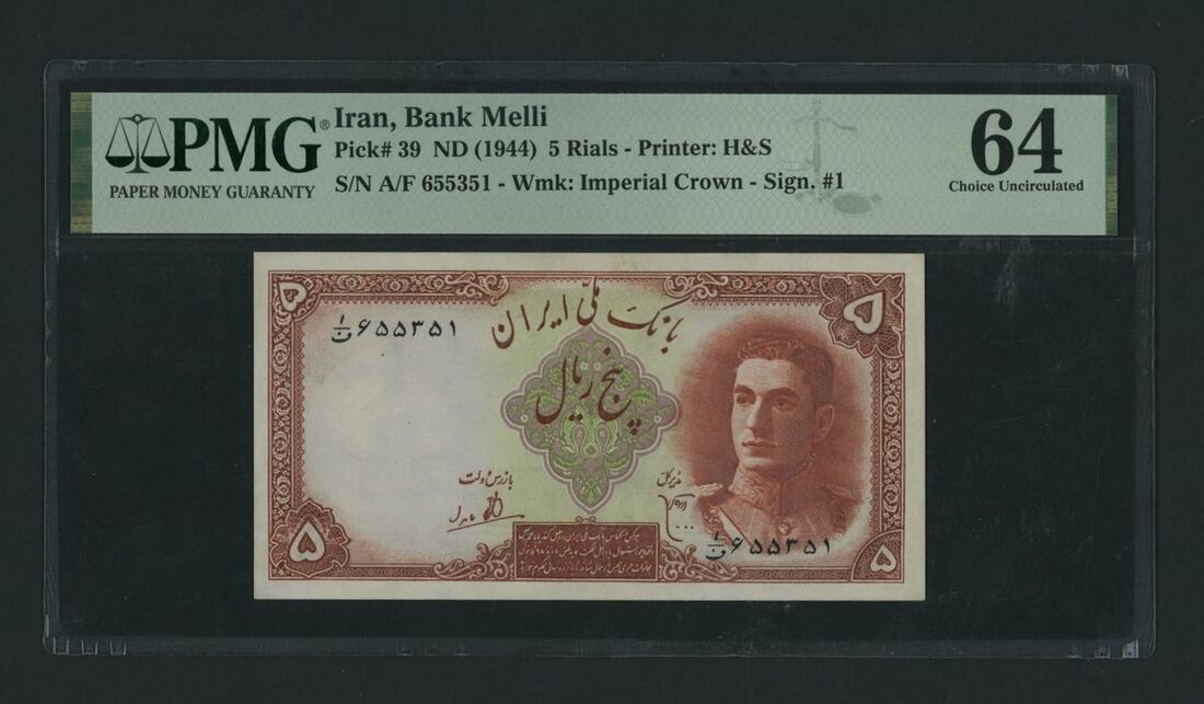 (x) Bank Melli, Iran, 5 Rials, ND (1944), serial number A/F 655351, (Pick 39, BNB 134), in PMG holder 64 Choice Uncirculated, pinhole