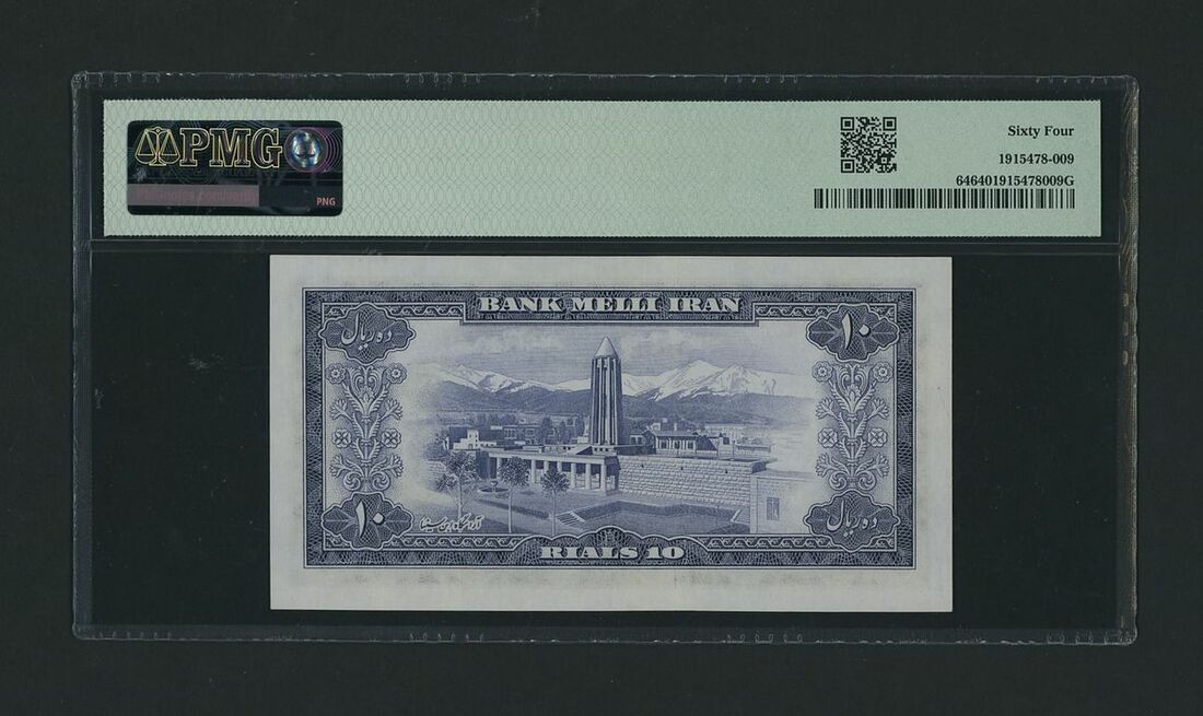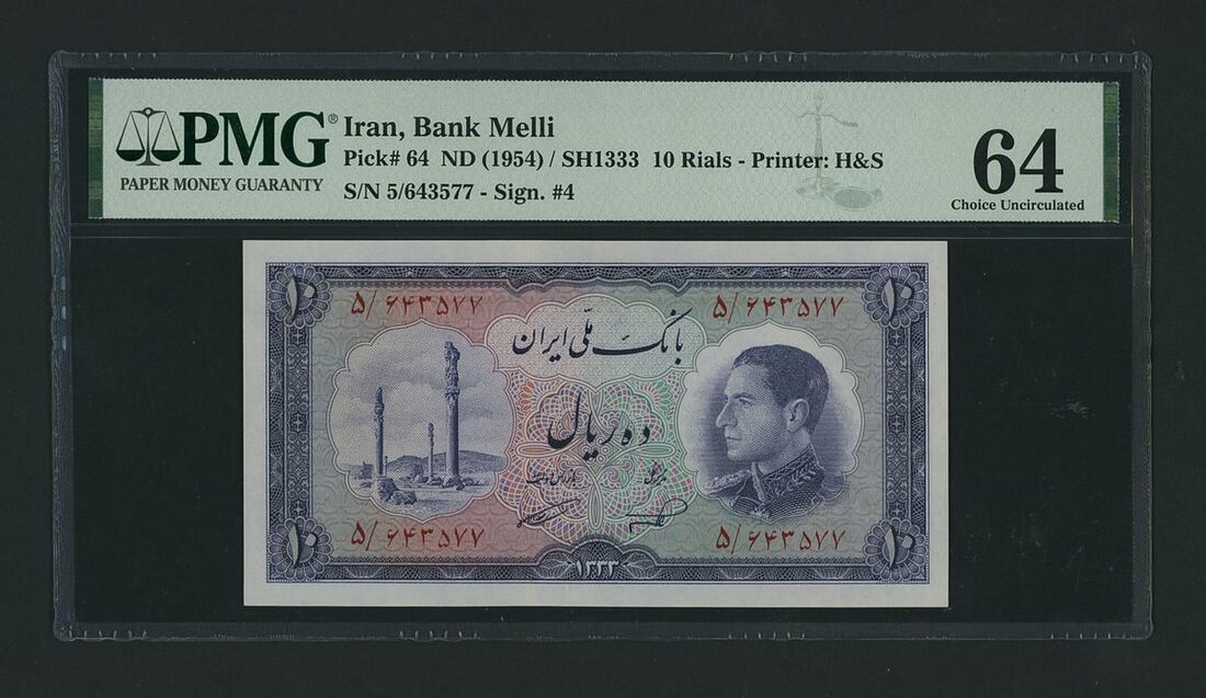 (x) Bank Melli, Iran, 10 Rials, ND (1954), serial number 5/643577, (Pick 64, BNB 154), in PMG holder 64 Choice Uncirculated