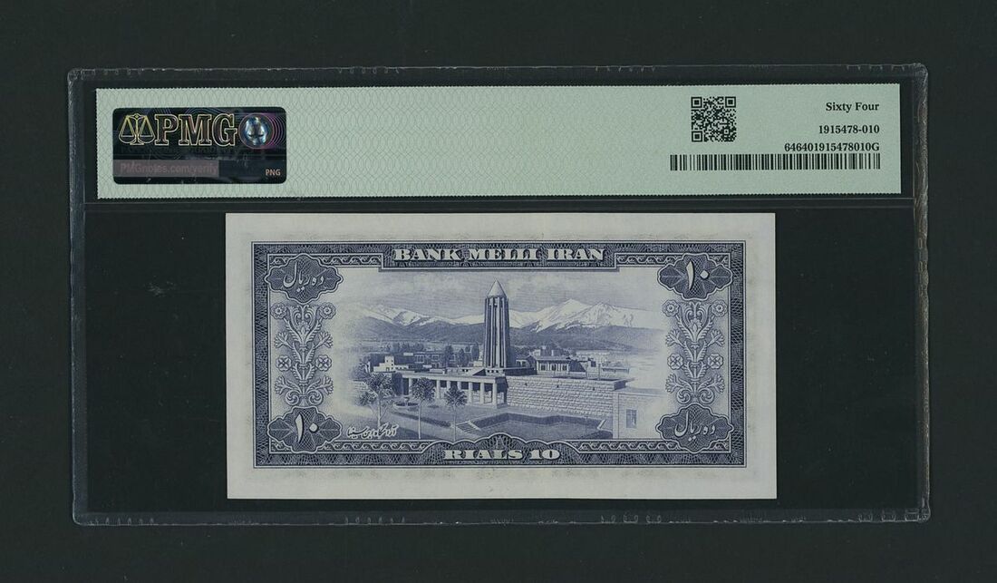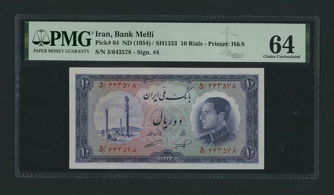(x) Bank Melli, Iran, 10 Rials, ND (1954), serial number 5/643578, (Pick 64, BNB 154), in PMG holder 64 Choice Uncirculated