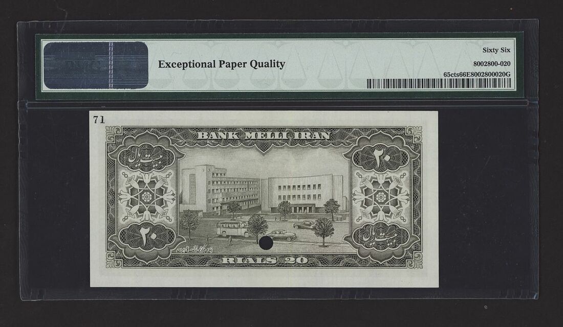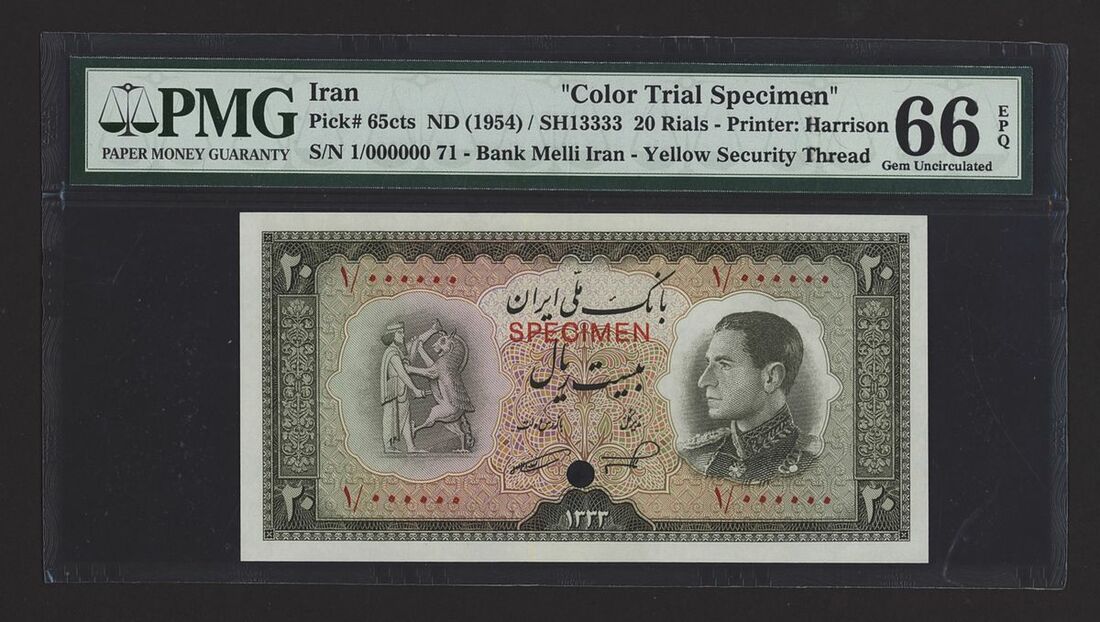 Bank Melli, Iran, [Top Pop] colour trial specimen 20 Rials, ND (1954), serial number 1/000000 71, (Pick 65cts, BNB 155), in PMG holder 66 EPQ Gem Uncirculated