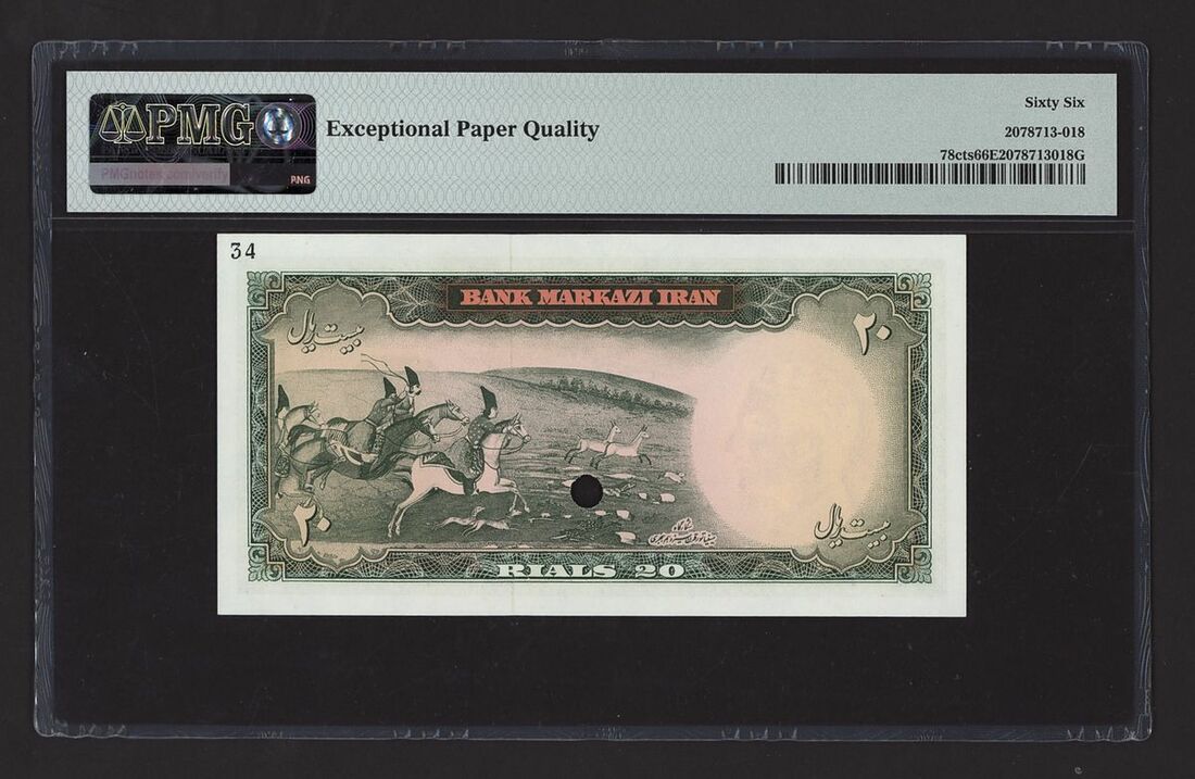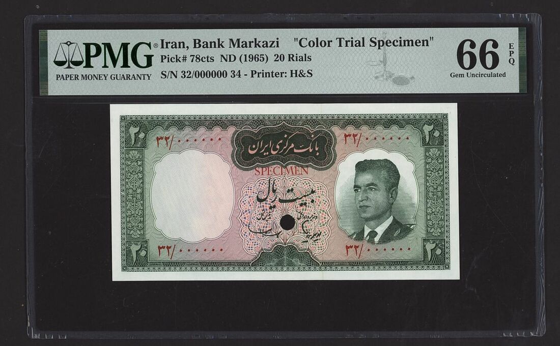 Bank Markazi, Iran, colour trial specimen 20 Rials, ND (1965), serial number 32/000000 34, (Pick 78cts, BNB 208), in PMG holder 66 EPQ Gem Uncirculated, only 1 note in higher grade at PMG