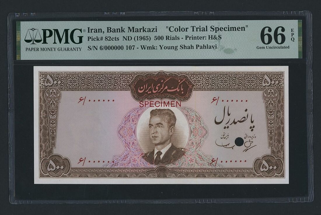 (x) Bank Markazi, Iran, colour trial specimen 500 Rials, ND (1965), serial number 6/000000 107, (Pick 82cts, BNB 212), in PMG holder 66 EPQ Gem Uncirculated, only 1 note in higher grade at PMG, scarce