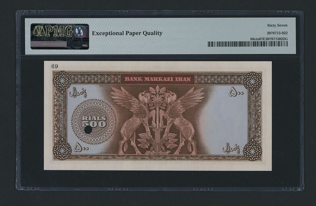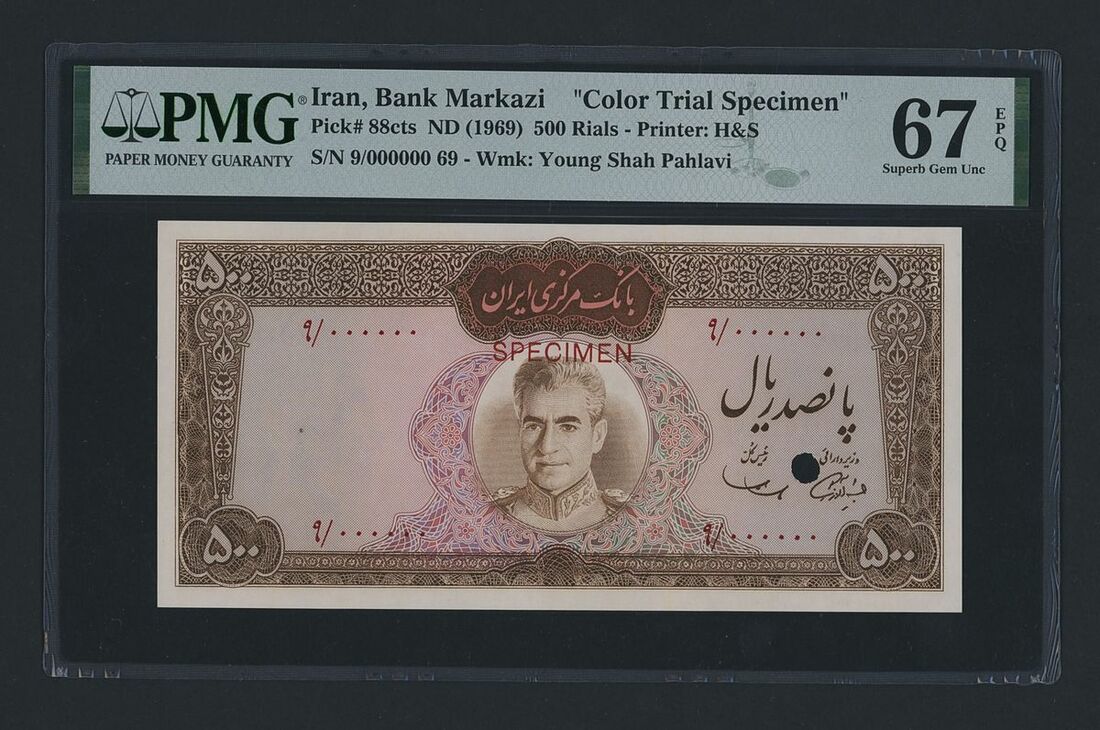 Bank Markazi, Iran, [Top Pop] colour trial specimen 500 Rials, ND (1969), serial number 9/000000 69, (Pick 88cts, BNB 218), in PMG holder 67 EPQ Superb Gem Uncirculated, tied for finest with 1 other note at PMG