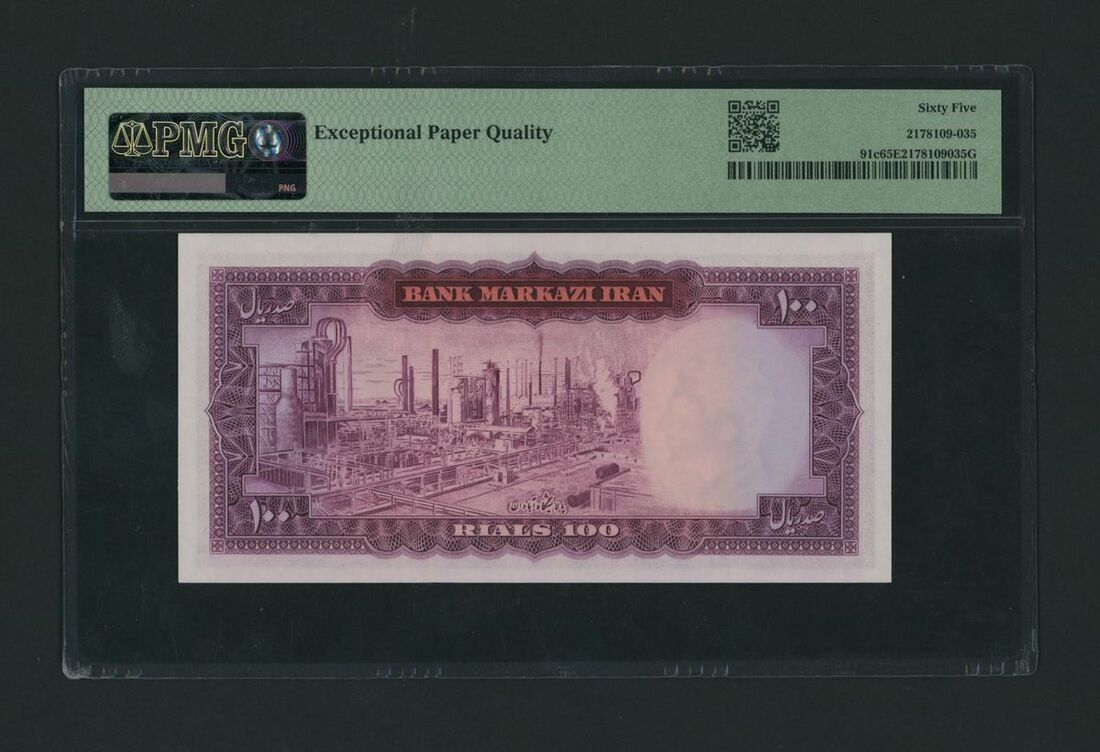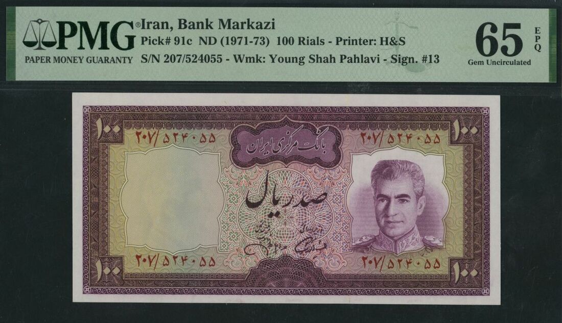 (x) Bank Markazi, Iran, 100 Rials, ND (1971-73), serial number 207/524055, (Pick 91c, BNB 222), in PMG holder 65 EPQ Gem Uncirculated