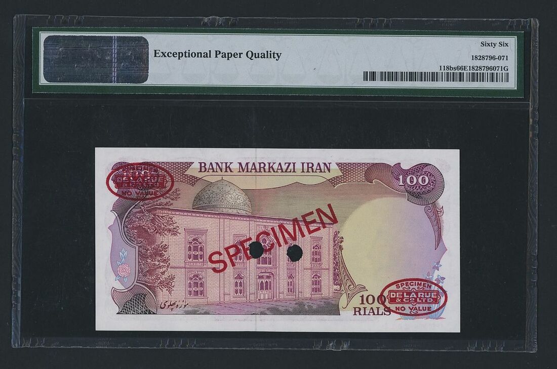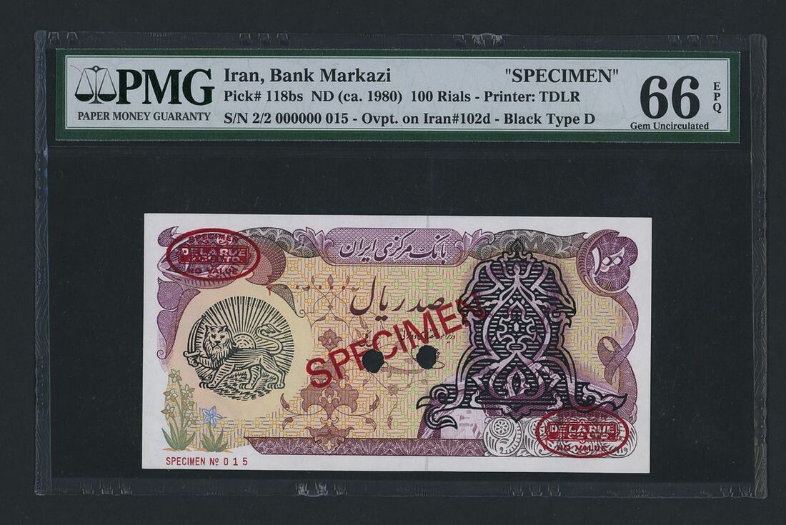 (x) Bank Markazi, Iran, specimen 100 Rials, ND (ca. 1980), serial number 2/2 000000 015, (Pick 118bs overprinted on Pick 102d, BNB 251bs overprinted on BNB 232), in PMG holder 66 EPQ Gem Uncirculated