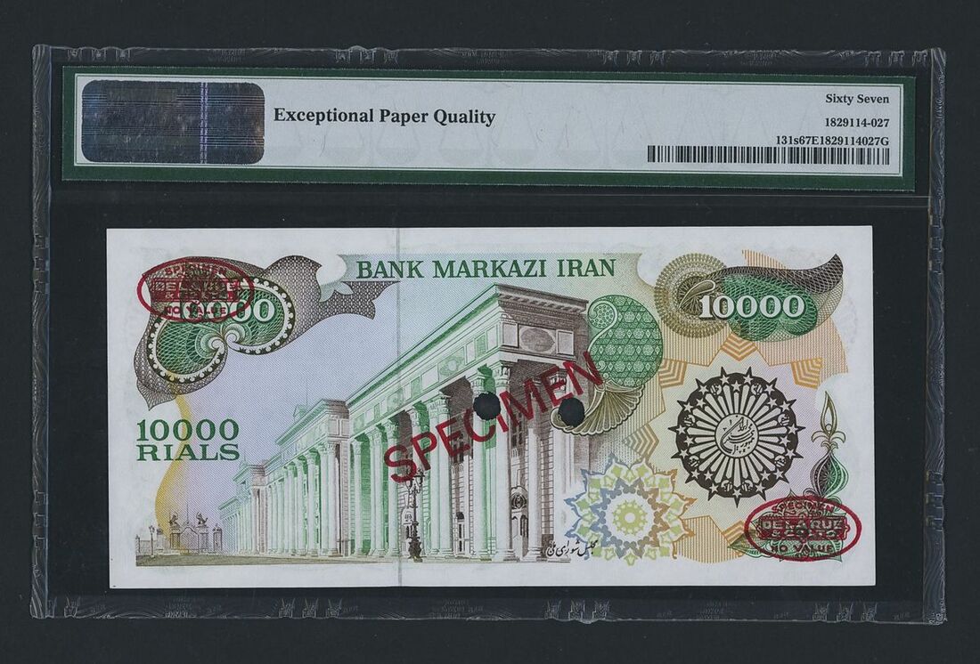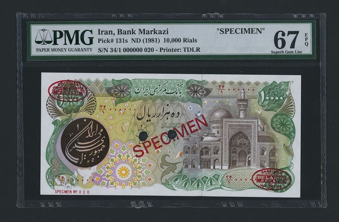 (x) Bank Markazi, Iran, specimen 10000 Rials, ND (1981), serial number 34/1 000000 020, (Pick 131s, BNB 266), in PMG holder 67 EPQ Superb Gem Uncirculated