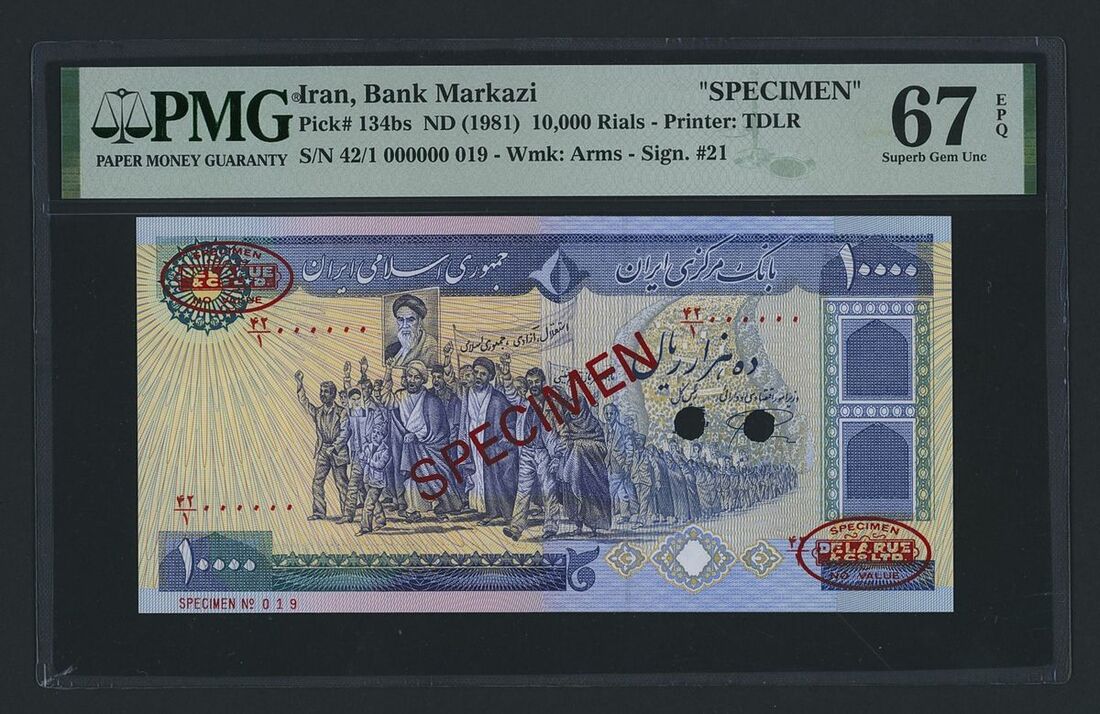 (x) Bank Markazi, Iran, [Top Pop] specimen 10000 Rials, ND (1981), serial number 42/1 000000 019, (Pick 134bs, BNB 274), in PMG holder 67 EPQ Superb Gem Uncirculated