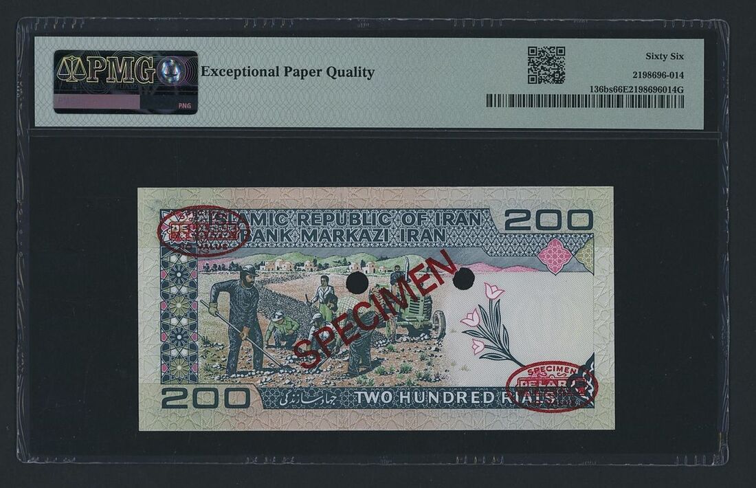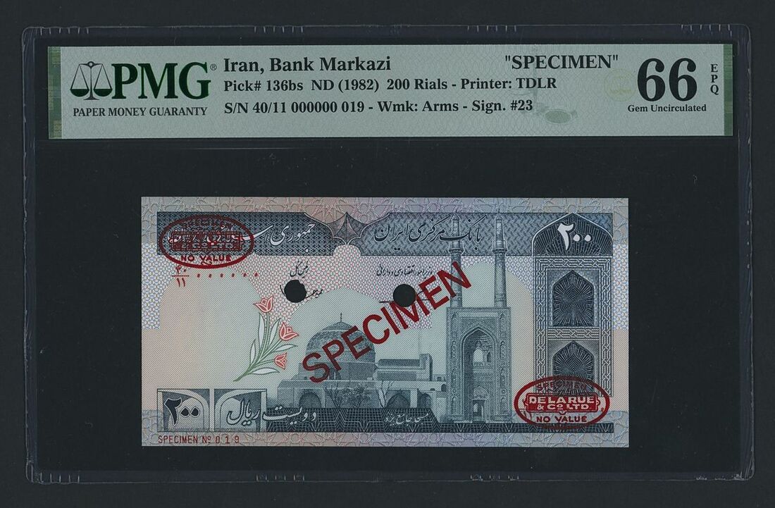 (x) Bank Markazi, Iran, specimen 200 Rials, ND (1982), serial number 40/11 000000 019, (Pick 136bs, BNB 268), in PMG holder 66 EPQ Gem Uncirculated, only 1 note in higher grade at PMG