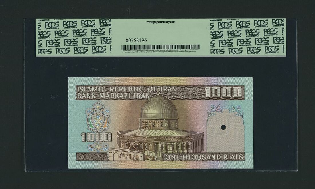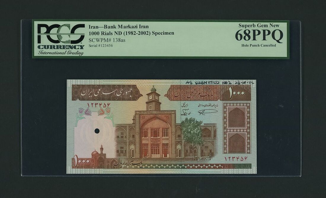 (x) Bank Markazi, Iran, specimen 1000 Rials, ND (1982-2002), serial number 123456, (Pick 138as, BNB 271), in PCGS holder 68 PPQ Superb Gem New, hole punch cancelled,