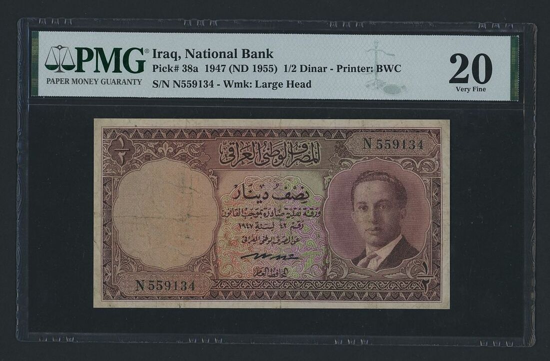 (x) National Bank of Iraq, 1/2 Dinar, 1947 (ND 1955), serial number N559134, (Pick 38a, BNB 212), in PMG holder 20 Very Fine