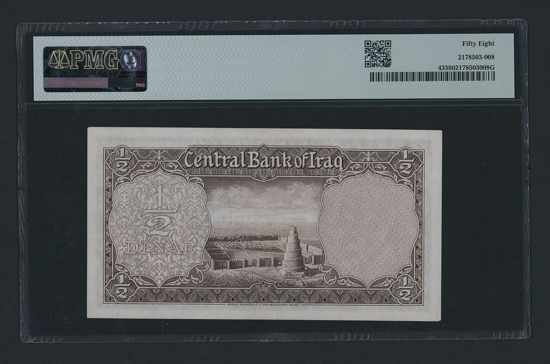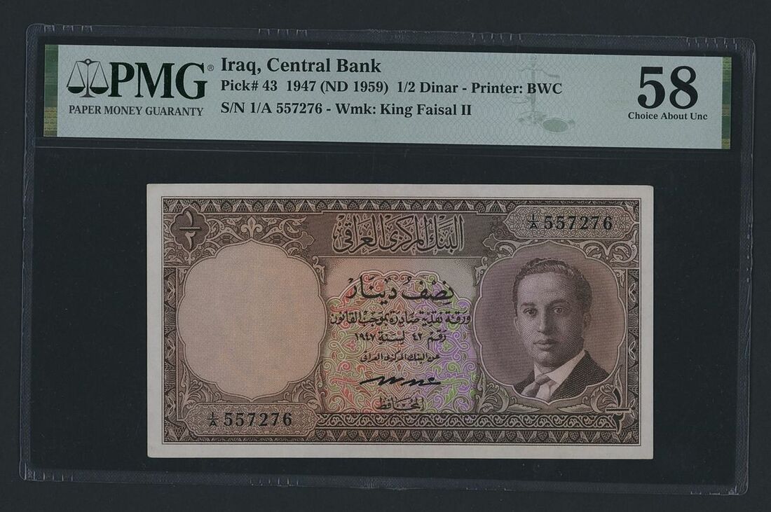 (x) Central Bank of Iraq, 1/2 Dinar, 1947 (ND 1959), serial number 1/A 557276, (Pick 43, BNB 302), in PMG holder 58 Choice About Uncirculated