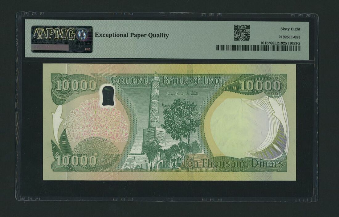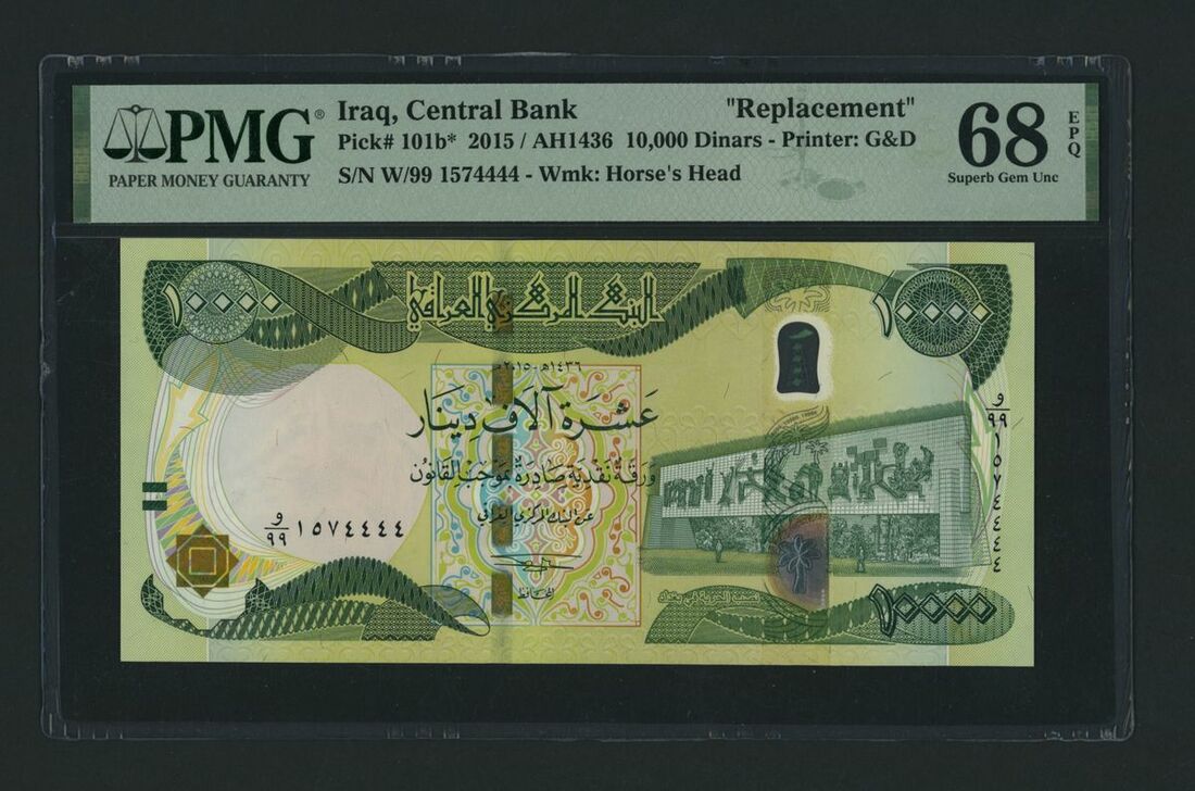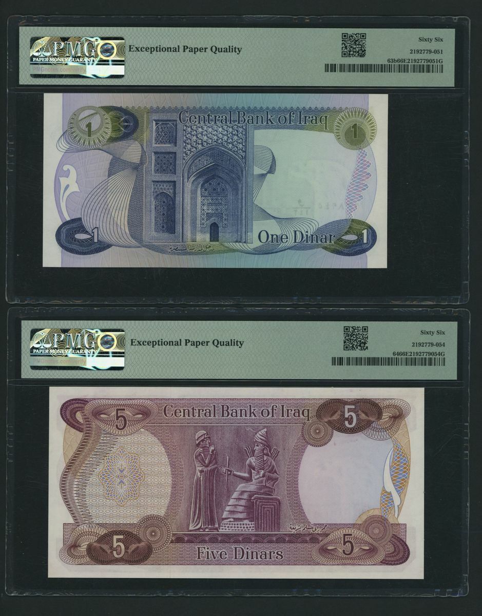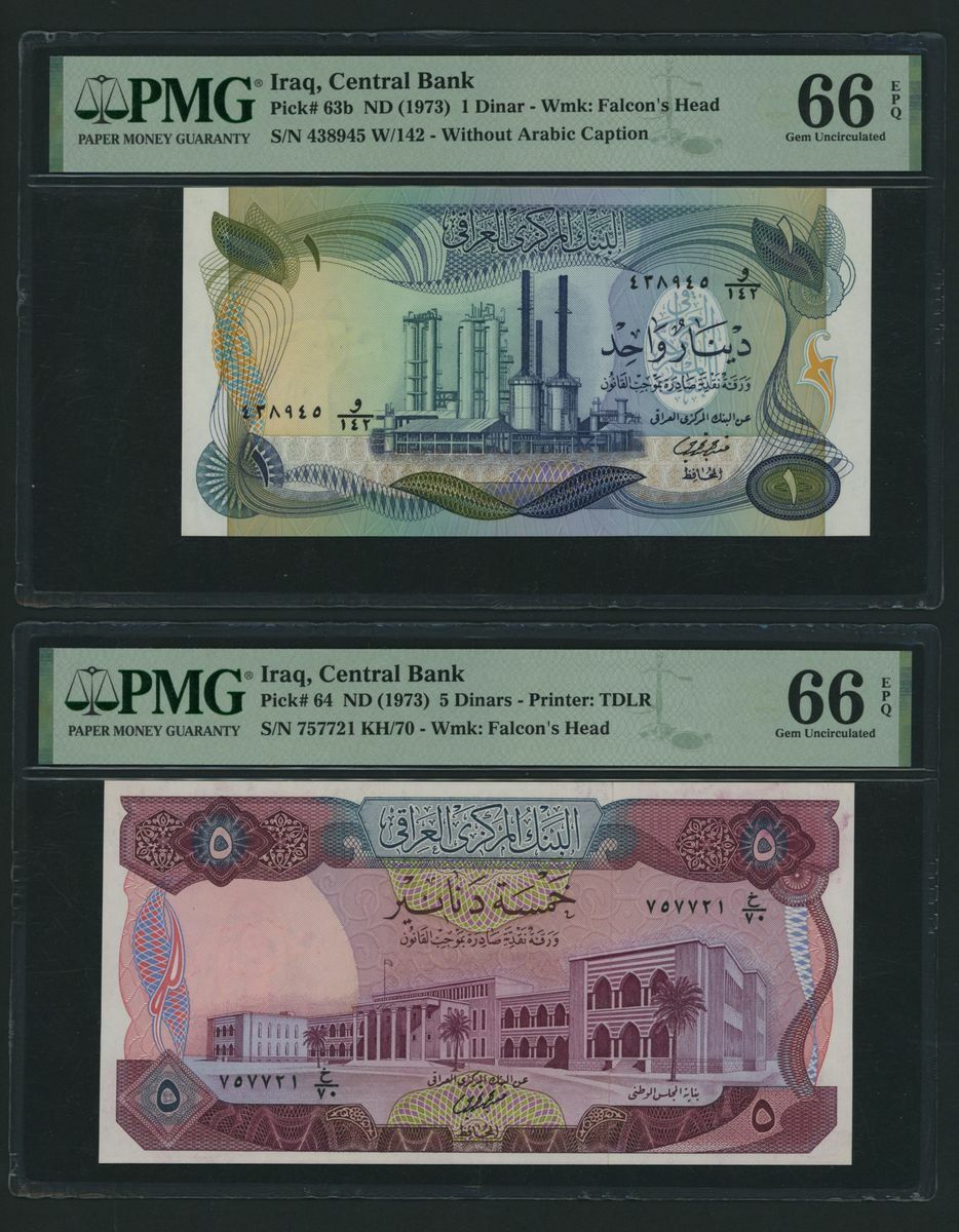 Central Bank, Iraq, [3 notes] 1, 5, 10000 Dinars, 1973-2015, 1 Dinar, ND (1973), serial number 438945 W/142; 5 Dinars, ND (1973), serial number 757721 KH/70; 10000 Dinars, 2015, serial number W/99 1574444