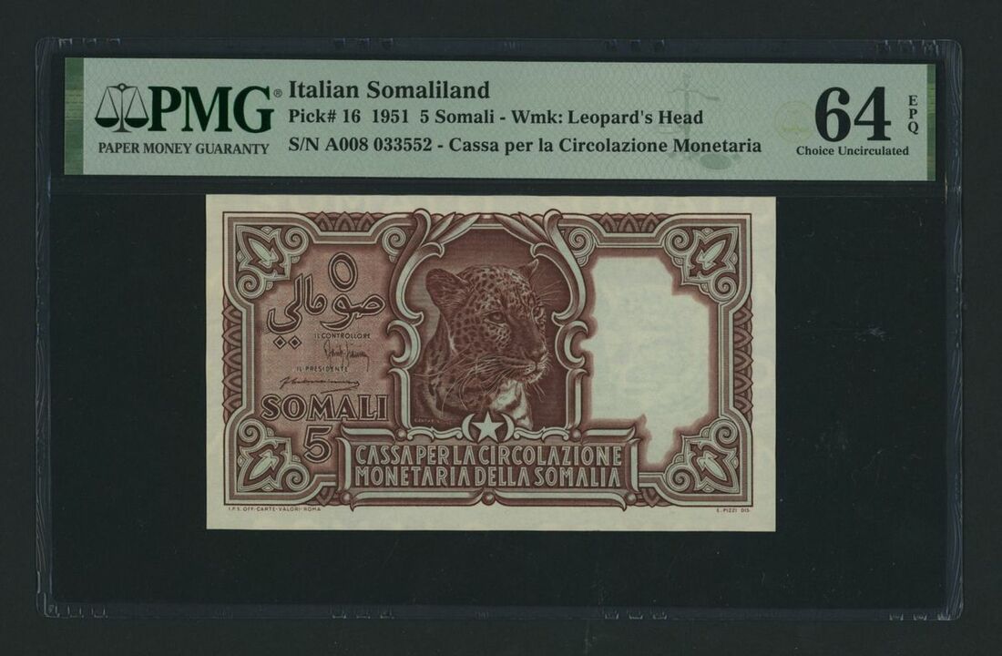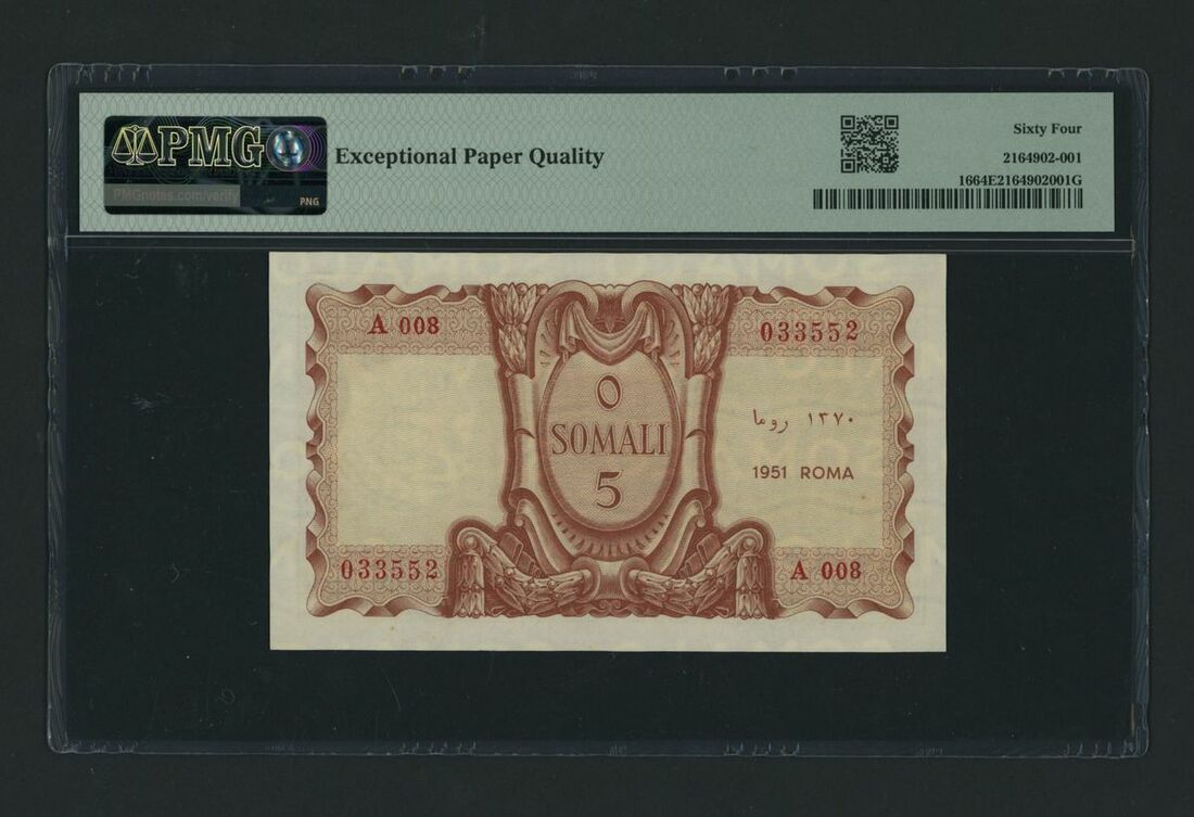 (x) Cassa per la Circolazione Monetaria, Italian Somaliland, 1 Somali, 1951, serial number A008 033552, (Pick 16, BNB 306), in PMG holder 64 EPQ Choice Uncirculated