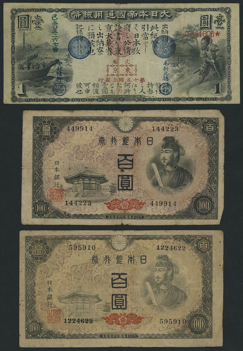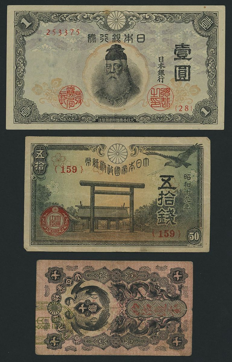 Japan, [8 notes] 10, 50 Sen, 1, 100 Yen, 1873-1946, Constitutional Monarchy, Japan, 1 yen, ND (1873), serial number G381606,