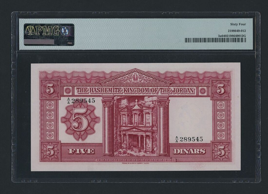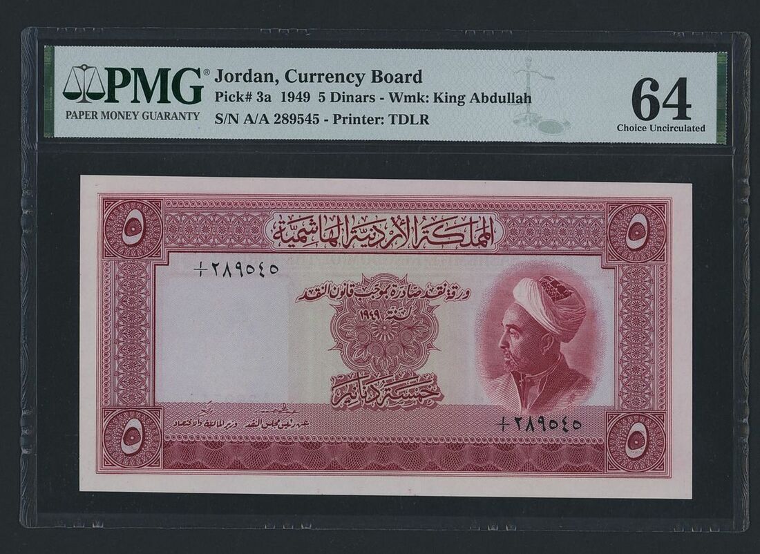 (x) Currency Board, Jordan, 5 Dinars, 1949, serial number A/A 289545, (Pick 3a, BNB 103), in PMG holder 64 Choice Uncirculated, scarce, especially in such a high grade