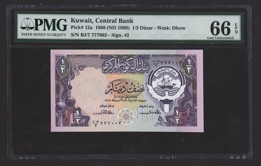 1/2 Dinar, 1968 (ND 1980), serial number BJ/7 777003,