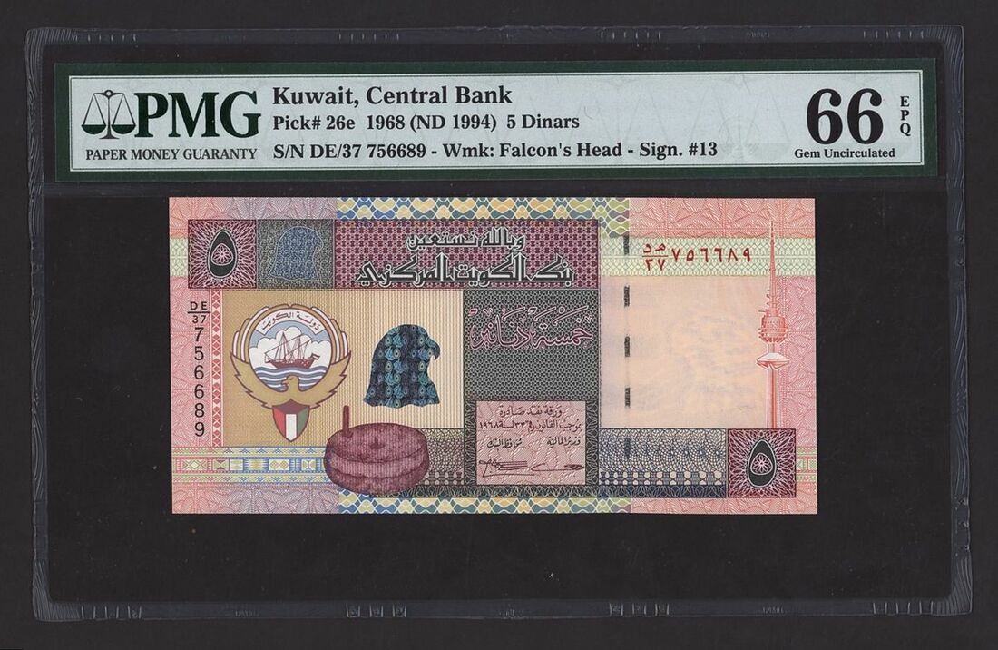 5 Dinars, 1968 (ND 1994), serial number DE/37 756689,