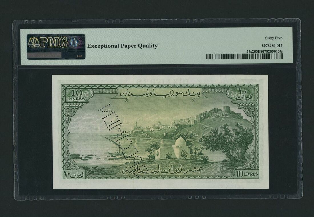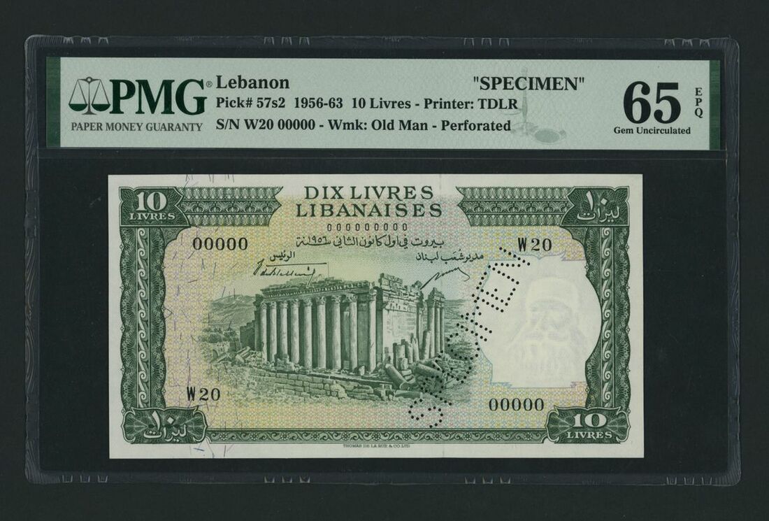 Lebanon, specimen 10 Livres, ND (1956-63), serial number W20 00000, (Pick 57s2, BNB 226as), in PMG holder 65 EPQ Gem Uncirculated