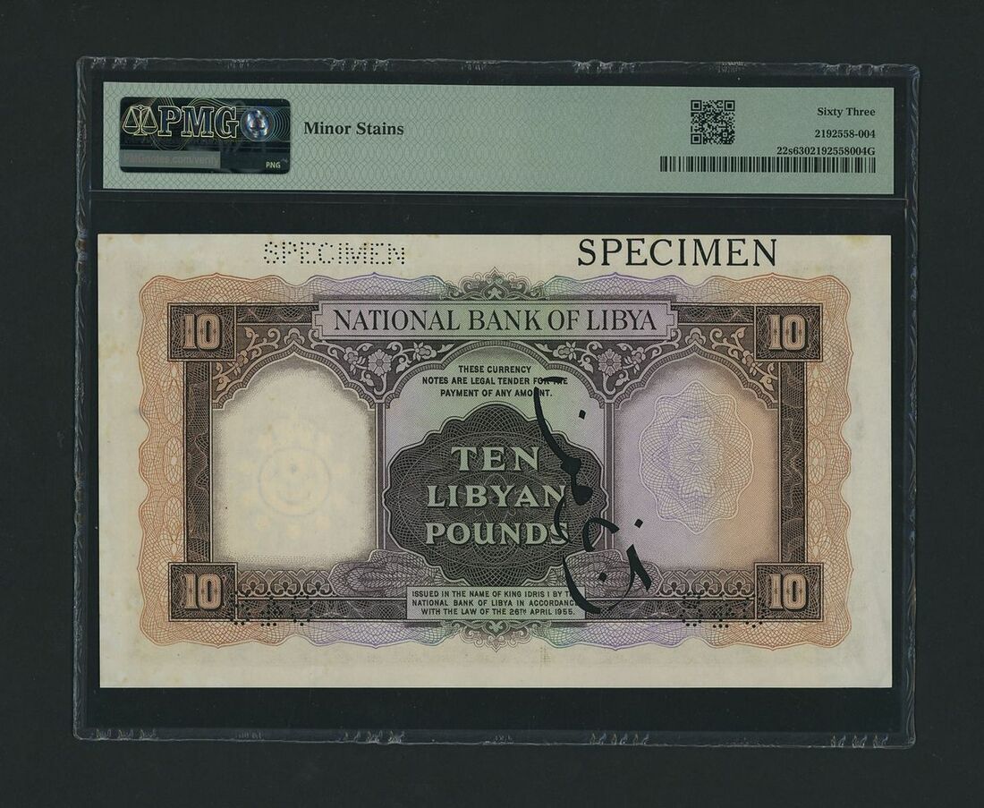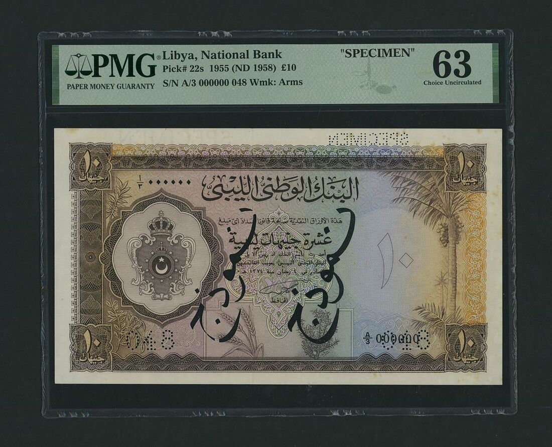 (x) National Bank of Libya, specimen £10, 1955 (ND 1958), serial number A/3 000000 048, (Pick 22s, BNB 304), in PMG holder 63 choice Uncirculated, minor stains