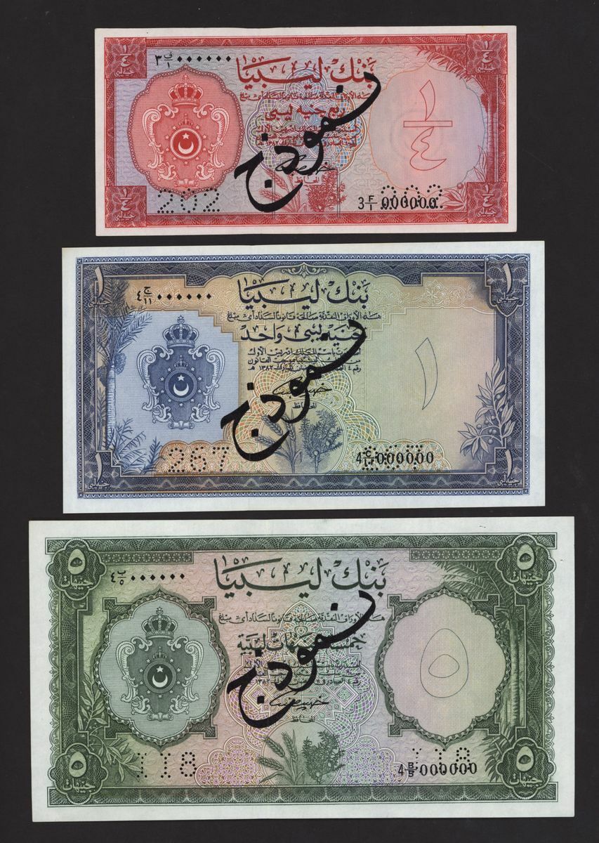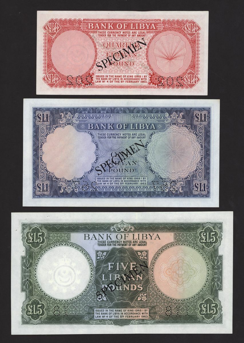 Bank of Libya, [3 notes] specimen 1/4, 1, 10 Pounds, 1963, 1/4 Libyan Pound, serial number 3F/1 000000, perforation 202; 1 Libyan Pound, serial number 4C/11 000000, perforation 297; 5 Libyan Pounds, serial number 4 B/5 000000, perforation 118