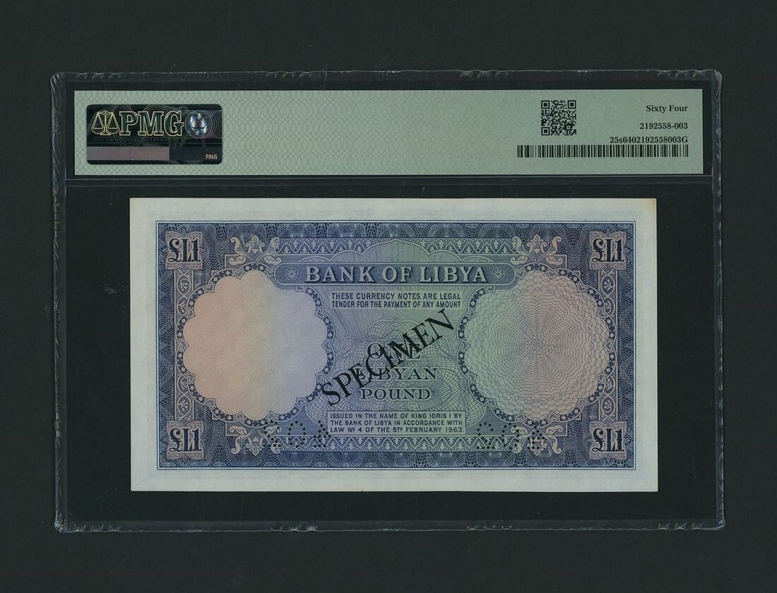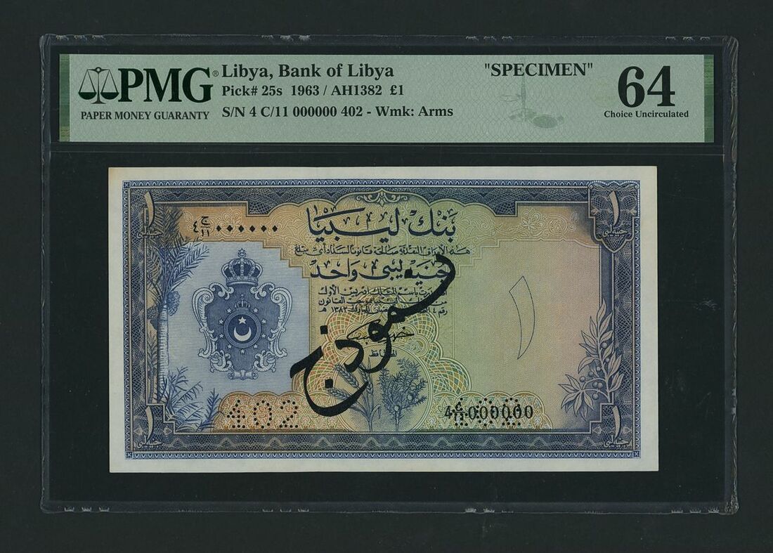 (x) Bank of Libya, specimen £1, 1963, serial number 4 C/11 000000 402, (Pick 25s, BNB 403), in PMG holder 64 choice Uncirculated, only 1 note in higher grade at PMG
