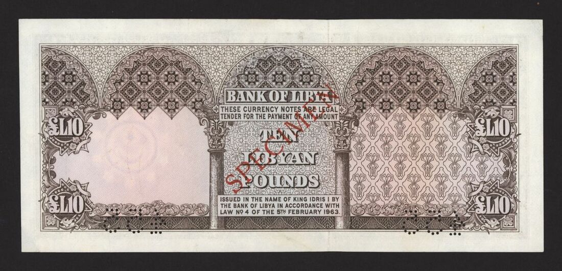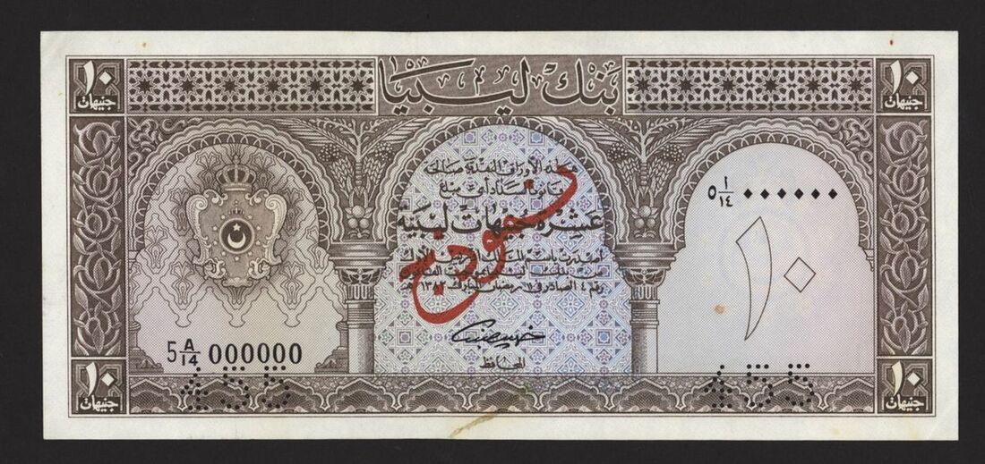 Bank of Libya, specimen 10 Pounds, 5th February 1963, serial number 5 A/14 000000, perforated 455, (Pick 32s, BNB 410as), about uncirculated, small stain