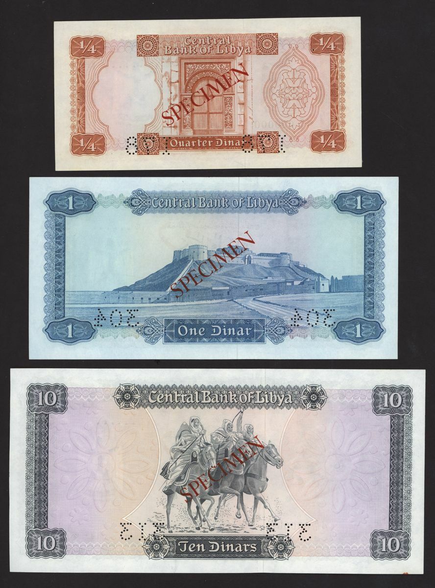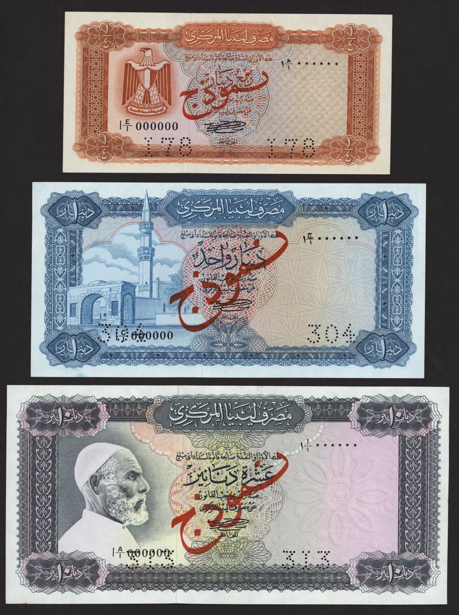 Central Bank of Libya, [3 notes] specimen 1/4, 1, 10 Dinars, ND (1971), 1/4 Dinar, serial number 1 E/1 000000, perforation 178; 1 Dinar, serial number 1 C/1 000000, perforation 304; 10 Dinars, serial number 1 A/1 000000, perforation 313