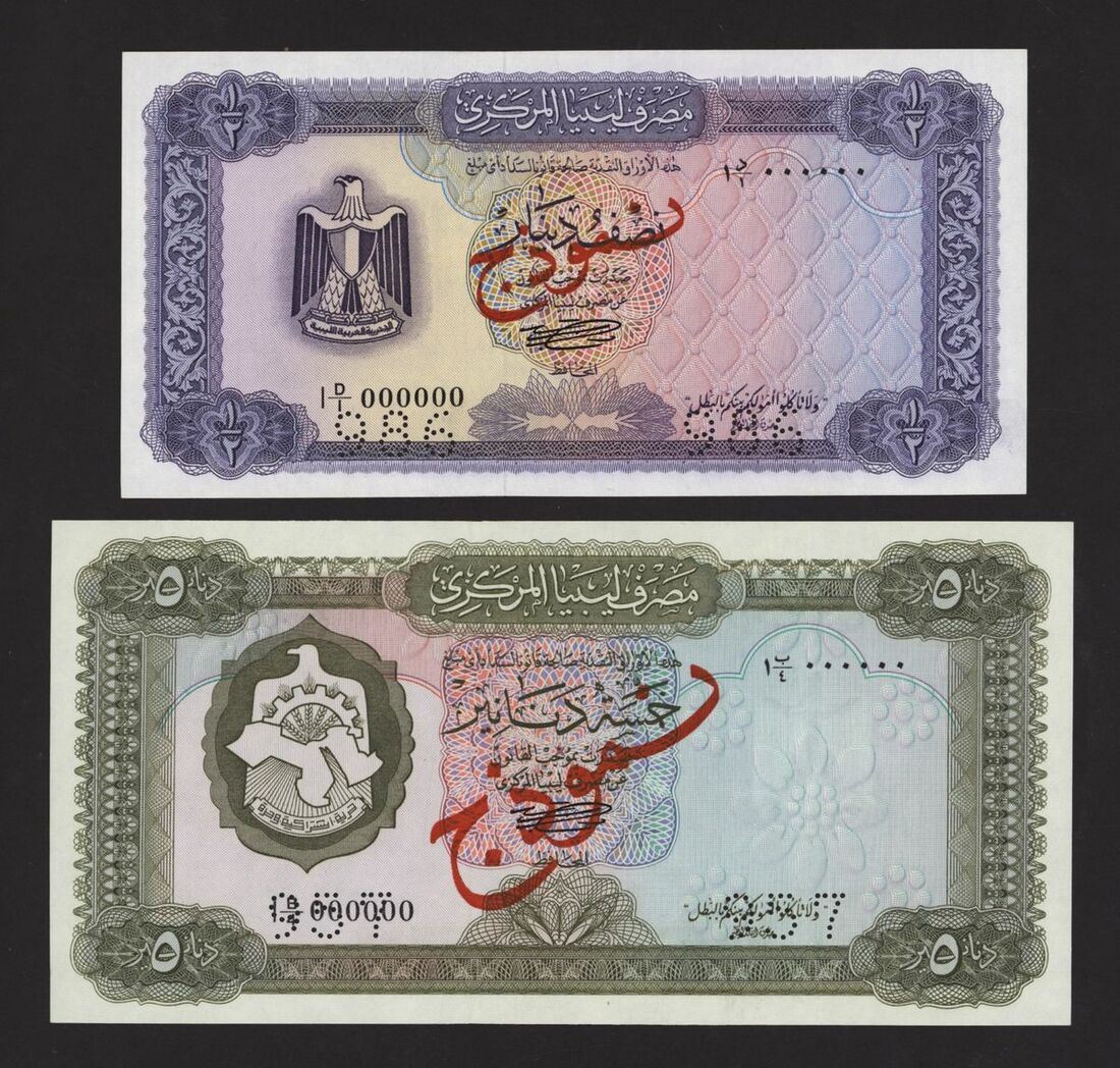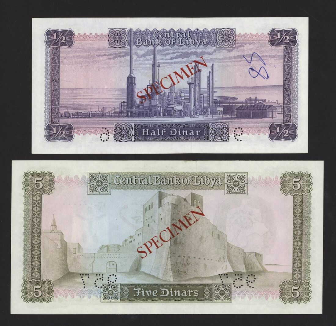 Central Bank of Libya, [2 notes] 1/2, 5 Dinars, ND (1972), 1/2 Dinar, serial number 1 D/1 000000, perforation 986; 5 Dinars, serial number 1 B/4 000000, perforation 957