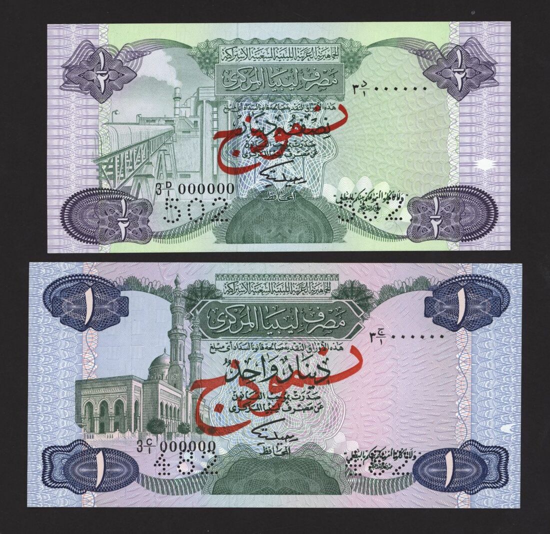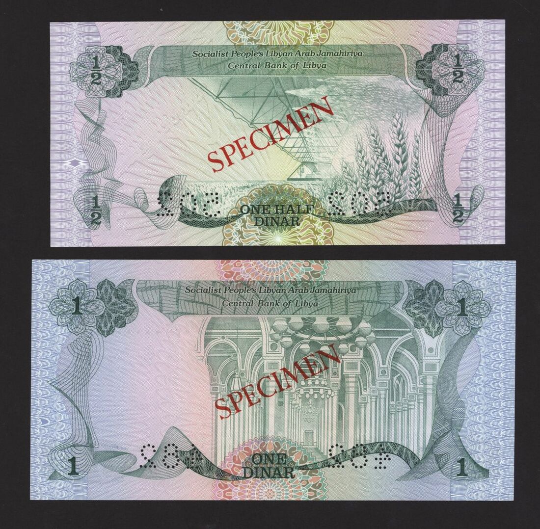 Central Bank of Libya, [2 notes] 1/2, 1 Dinar, ND (1984), collection of notes from the Socialist People's Libyan Arab Jamahiriya.