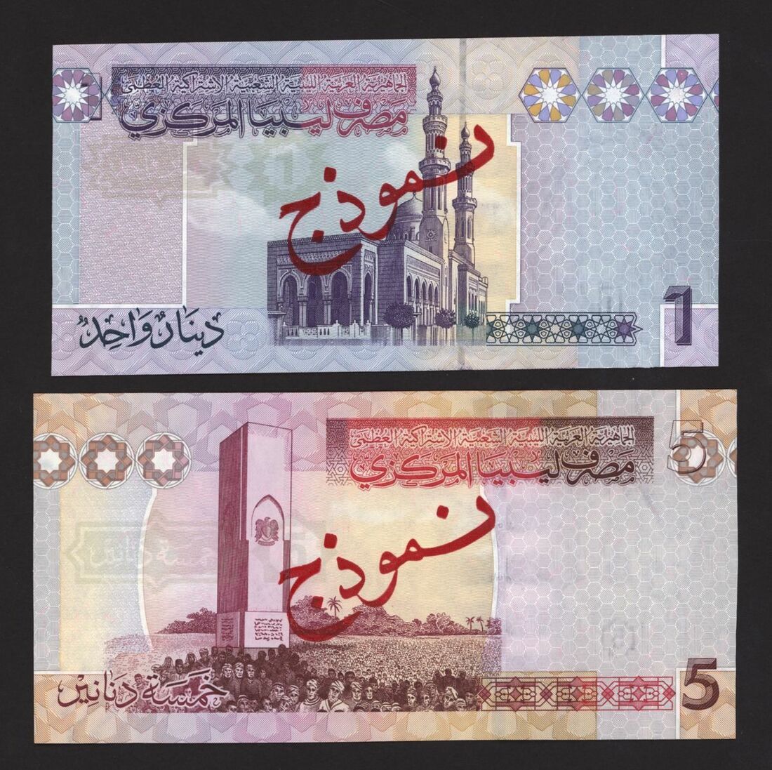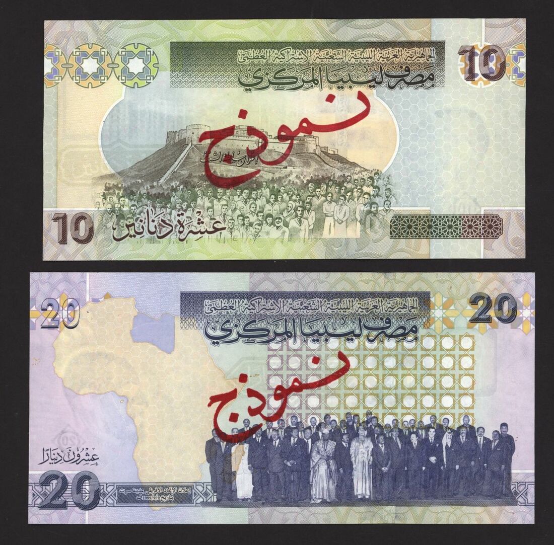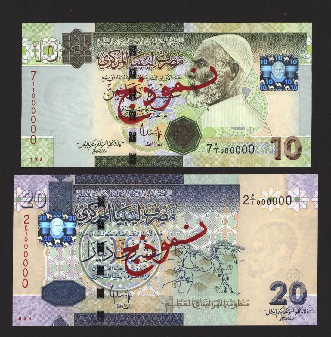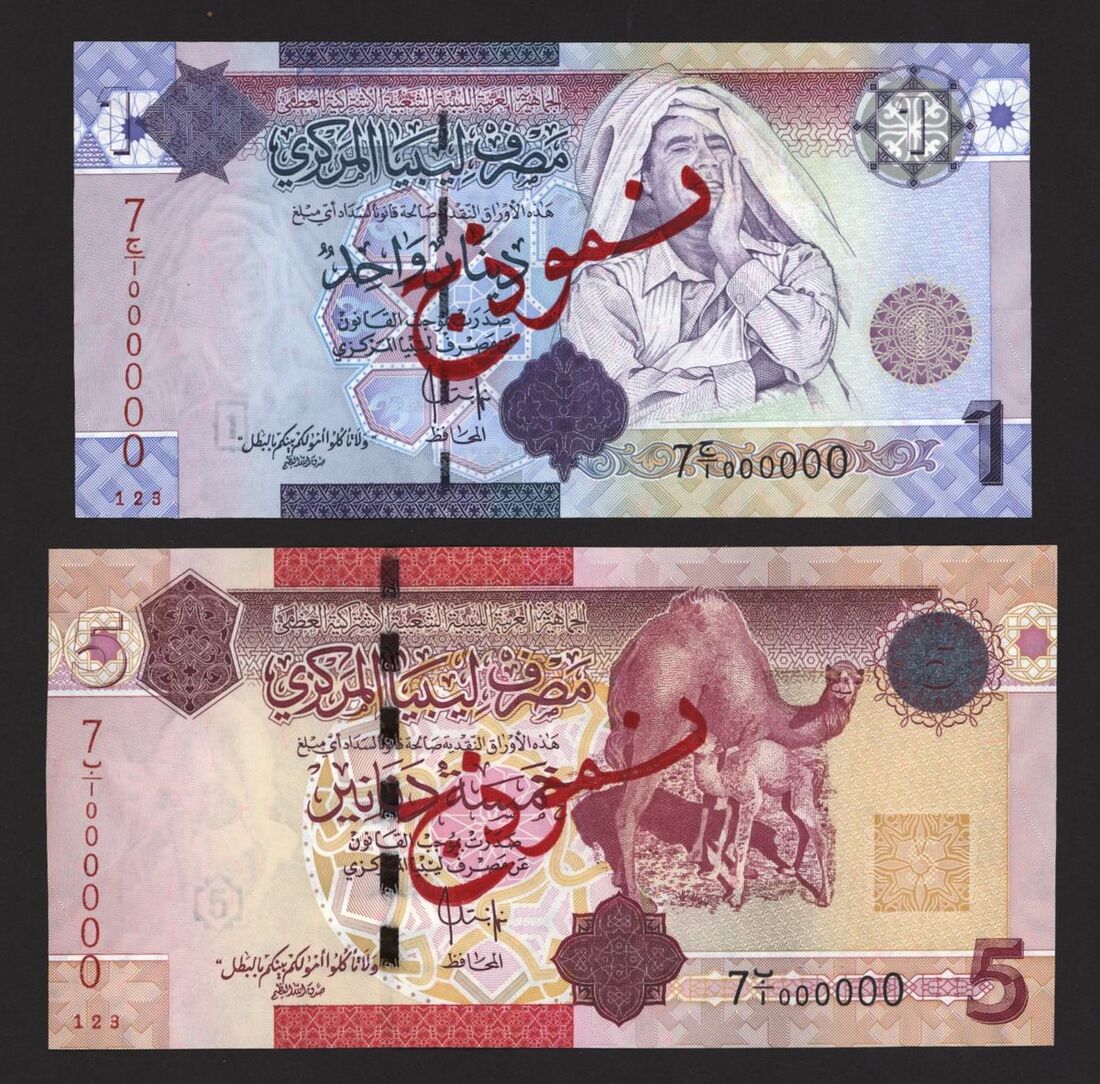Central Bank of Libya, [4 notes] 1, 5, 10, 20 Dinars, ND (2009), 1 Dinar, serial number 7 000000, specimen number 123; 5 Dinars, serial number 7 000000, specimen number 123; 10 Dinars, serial number 7 000000, specimen number 123; 20 Dinars, serial number 2 000000, specimen number 008