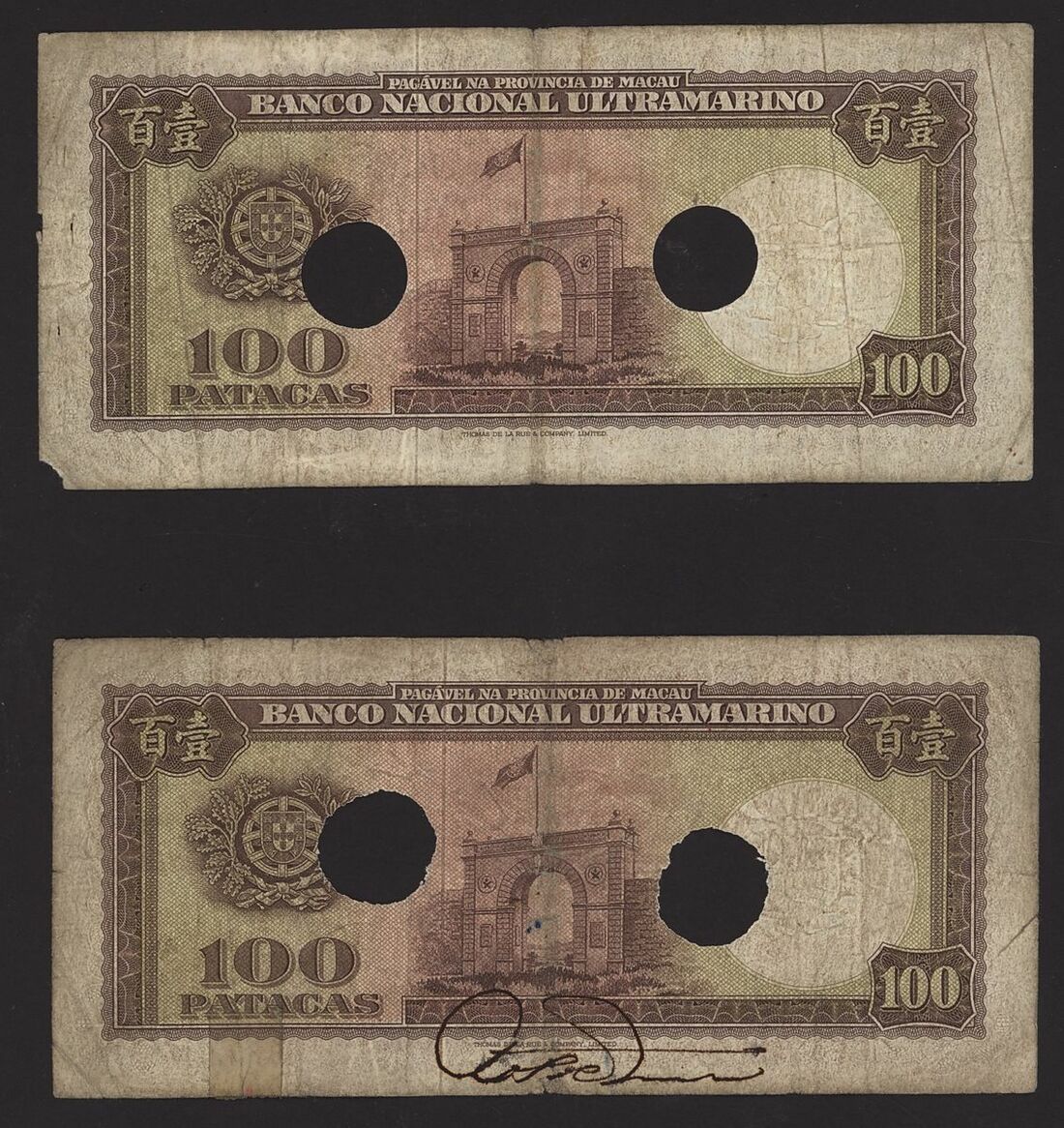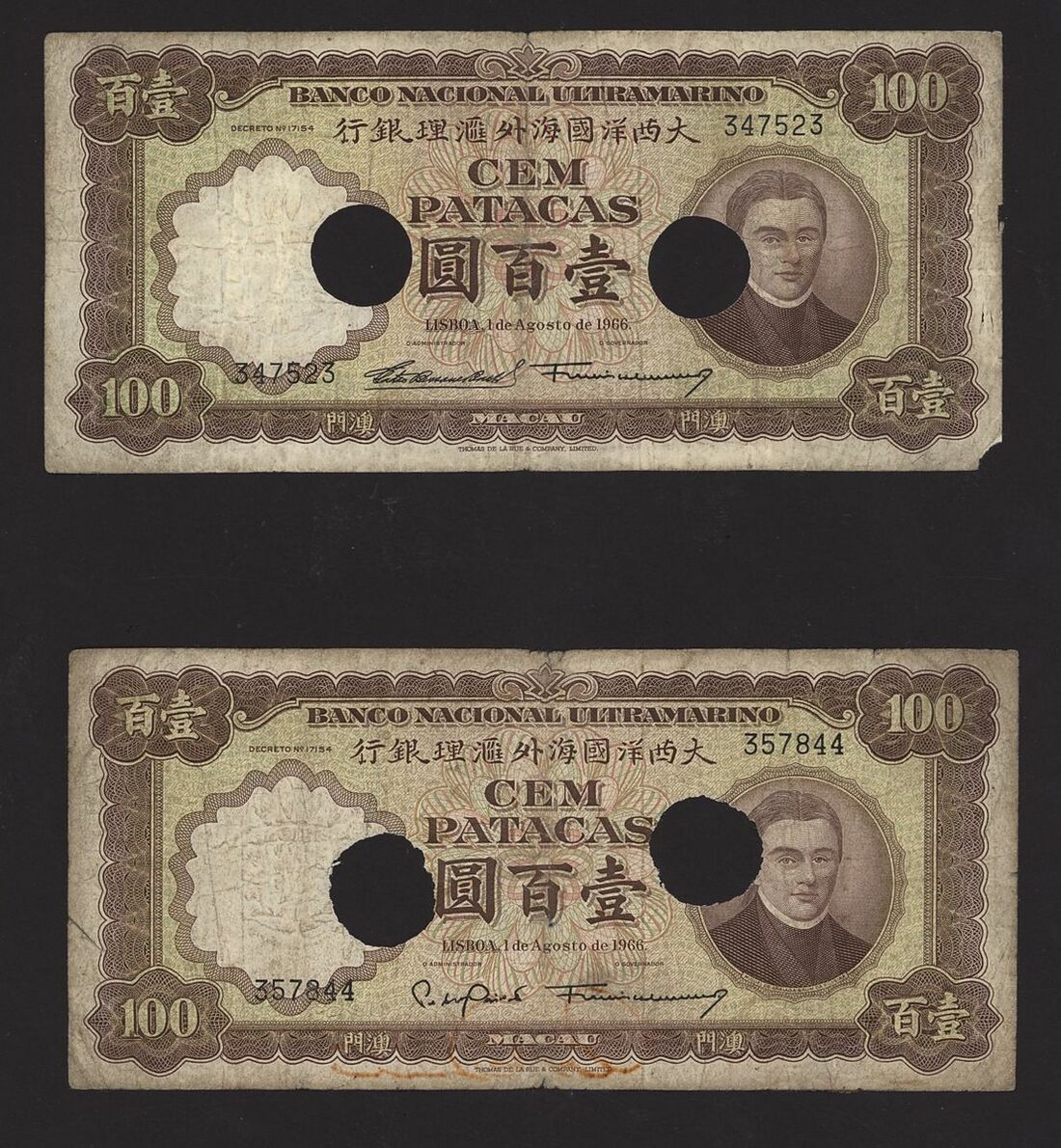 (x) Banco Nacional Ultramarino, Macau, [2 notes] 100 Patacas, Lisbon, 1st August 1966, notes have different signatures on obverse, both are unidentified signatures