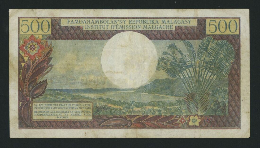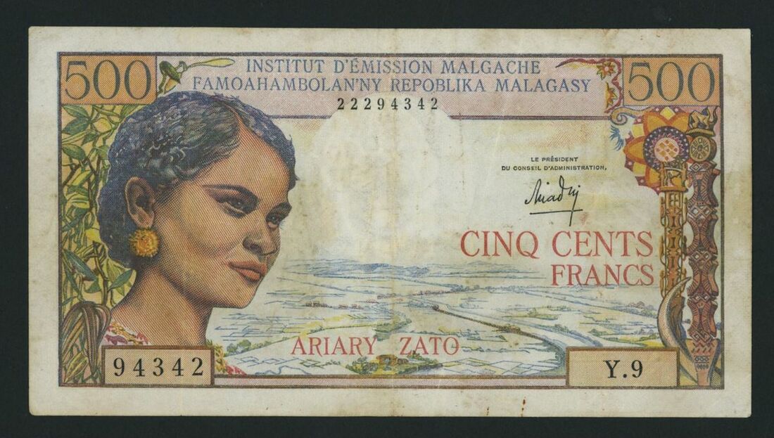 Institut d'Emission Malgache, Malagasy Republic, 500 Francs, ND (1966), serial number Y.9 94342, (Pick 58a BNB 108a), good fine