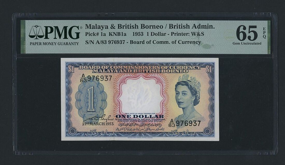 (x) British Administration, Malaya & British Borneo, $1, 21st March 1953, serial number A/83 976937, (Pick 1a, BNB 101a), in PMG holder 65 EPQ Gem Uncirculated